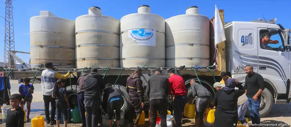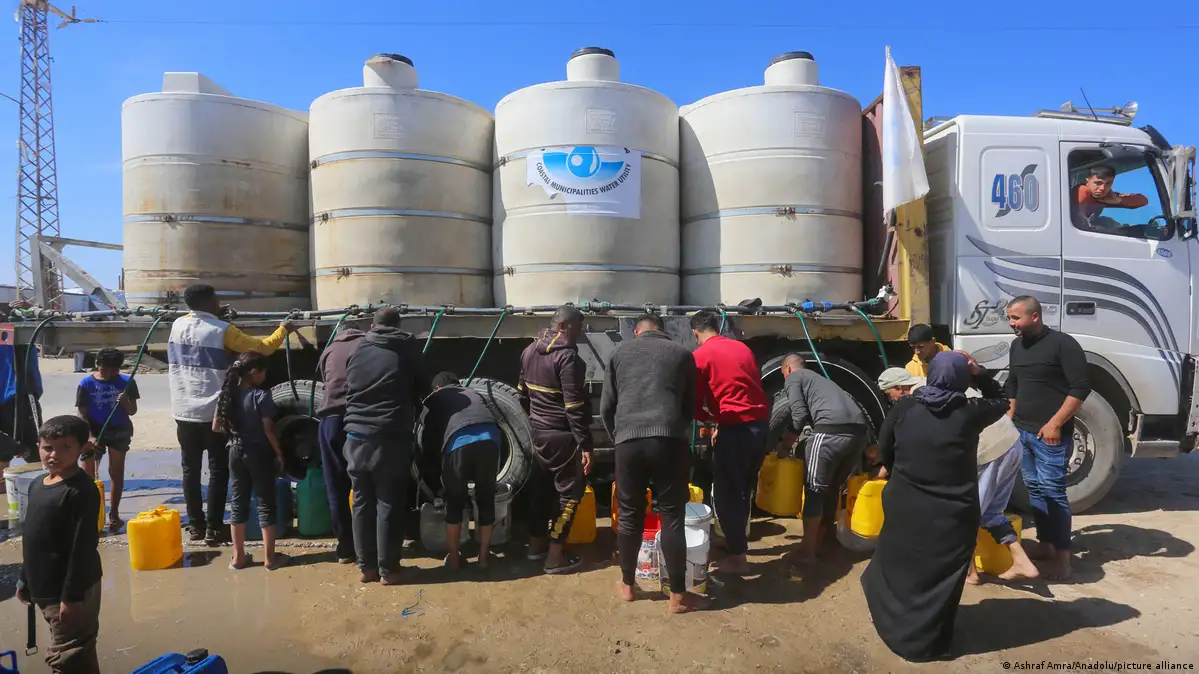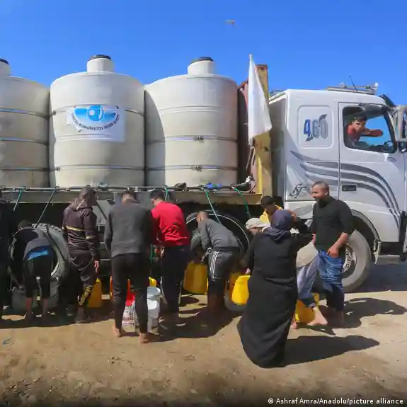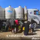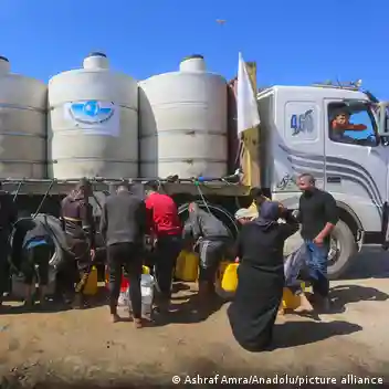 نازحون في خان يونس مشغولون بملء عبوات المياه التي توزعها صهاريجصورة من: Ashraf Amra/Anadolu/picture alliance