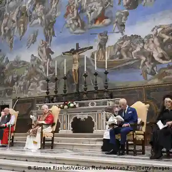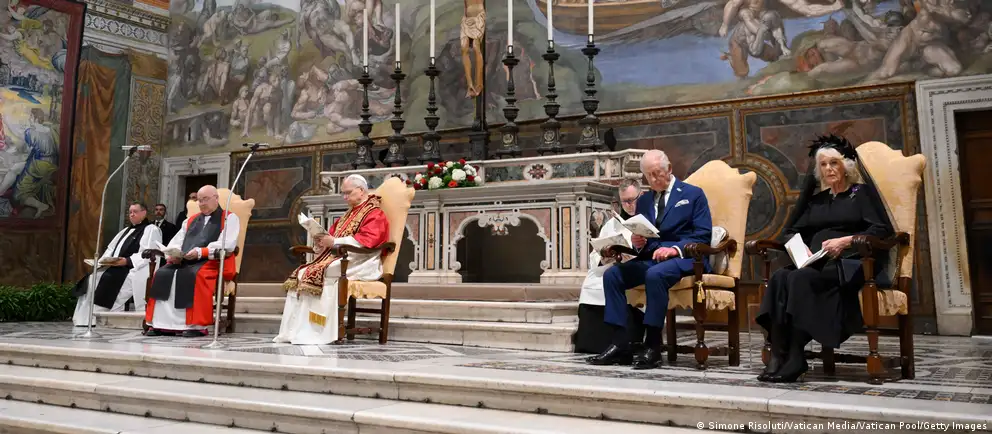 بعد خمسة قرون من انفصال الملك هنري الثامن عن روما، لأول مرة يقوم ملك إنجليزي بصلاة مشتركة مع بابا كاثوليكي. الملك تشارلز الثالث والملكة كاميلا في صلاة مع البابا ليو في كنيسة سيستينا بالفاتيكان (الخميس: 23/10/2025)صورة من: Simone Risoluti/Vatican Media/Vatican Pool/Getty Images