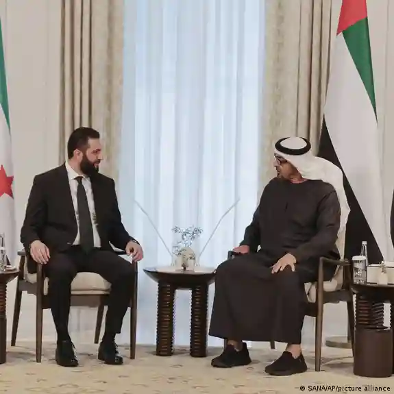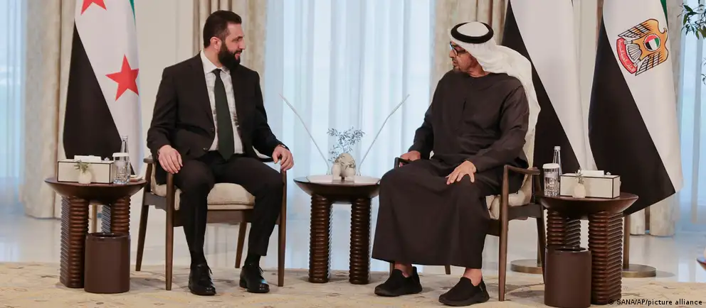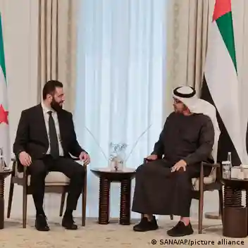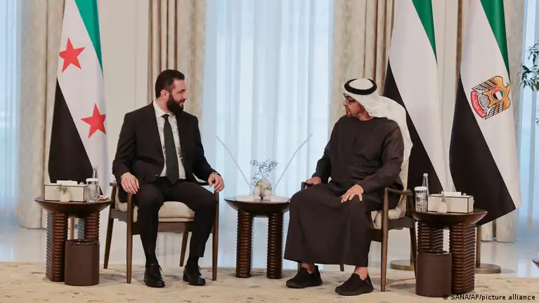 أكد محمد بن زايد خلال استقباله الشرع اليوم في أبو ظبي حرصه على "إعادة بناء سوريا" ودعم السوريين لمواجهة "تحديات المرحلة الانتقالية"صورة من: SANA/AP/picture alliance