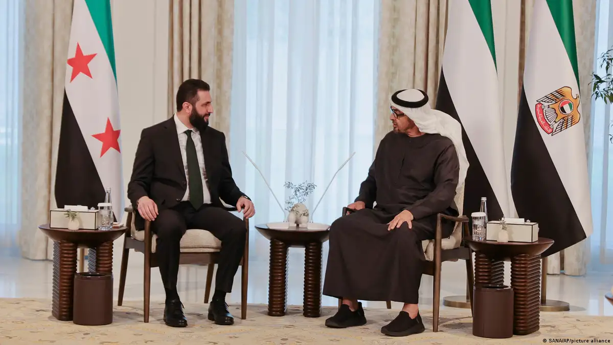 وفي يناير / كانون الثاني 2025 جرى اتصال هاتفي بين الشرع والرئيس الإماراتي بحثا خلاله في سبل تعزيز العلاقات الثنائية بين البلدين. وبناء على سياستها القائمة على عدم التسامح مع الإسلام السياسي، تراقب أبوظبي بريبة القيادة الجديدة في دمشق في ظل تخوفها من نفوذ تركيا، الحليف الأبرز للسلطات السورية الجديدة، بحسب محللين.