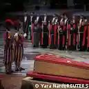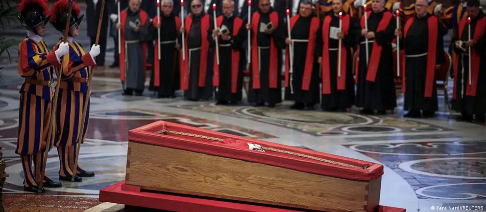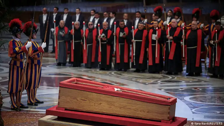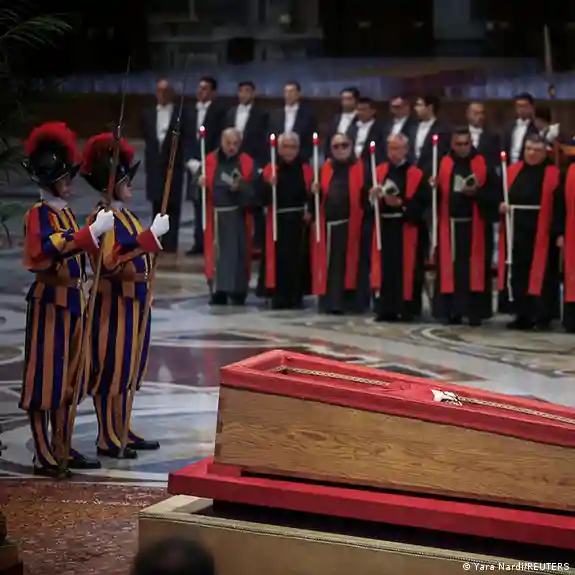 تدفق عشرات الآلاف على الفاتيكان لإلقاء نظرة الوداع على جثمان البابا فرنسيس (في الصورة "الحرس السويسري" المسؤول عن أمن الفاتيكان، يقف أمام نعش البابا في كنيسة القديس بطرس)صورة من: Yara Nardi/REUTERS