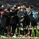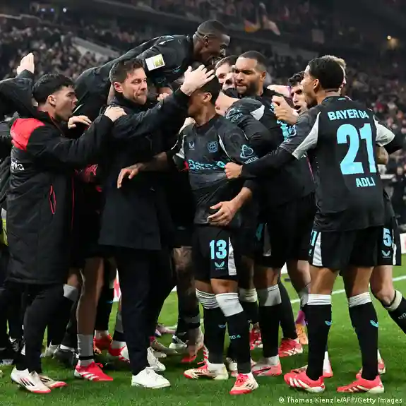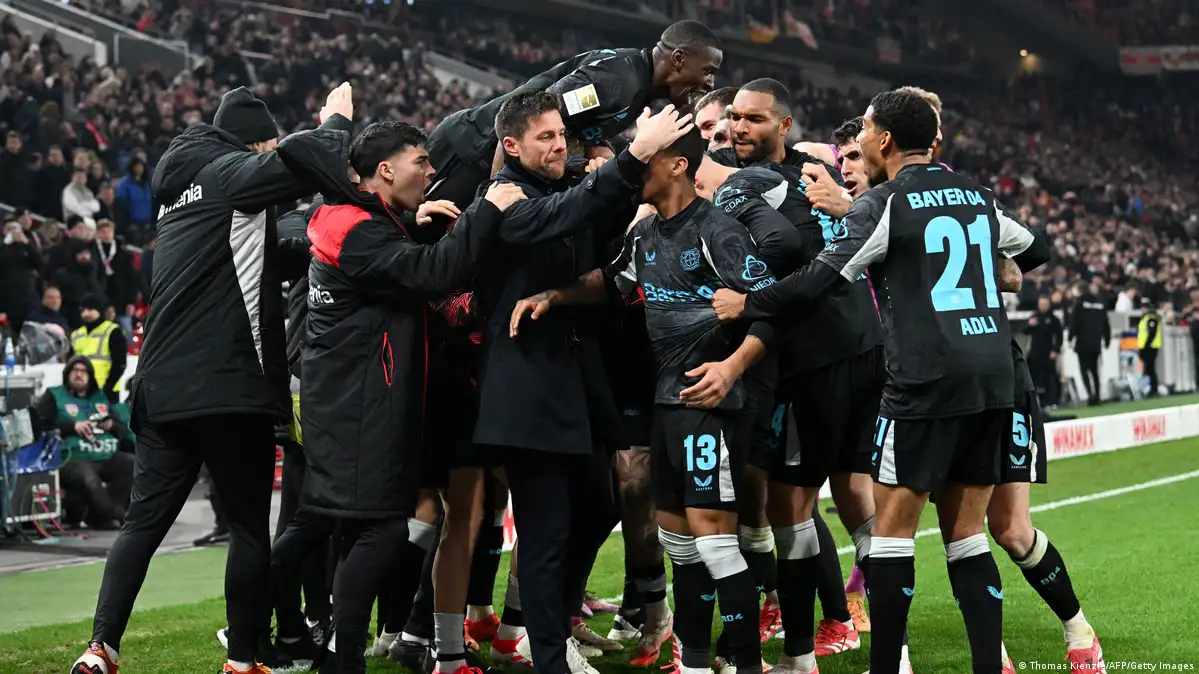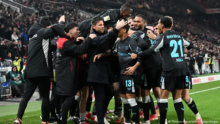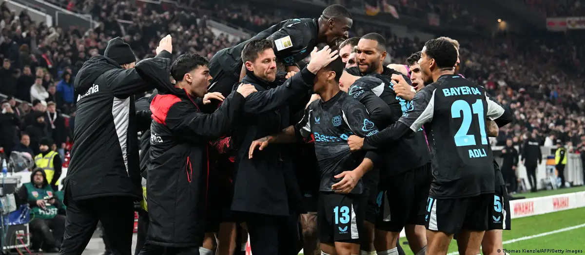 لاعبو ليفركوزن يحتفلون مع المدرب تشابي ألونسو بهدف باتريك شيك الذي منحهم الفوز على شتوتغارت وأعادهم من جديد للمنافسة على لقب البوندسليغا. (16/3/2025)صورة من: Thomas Kienzle/AFP/Getty Images