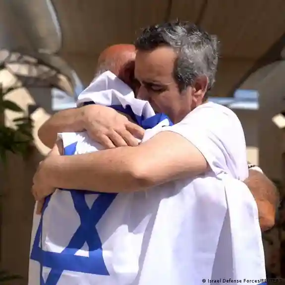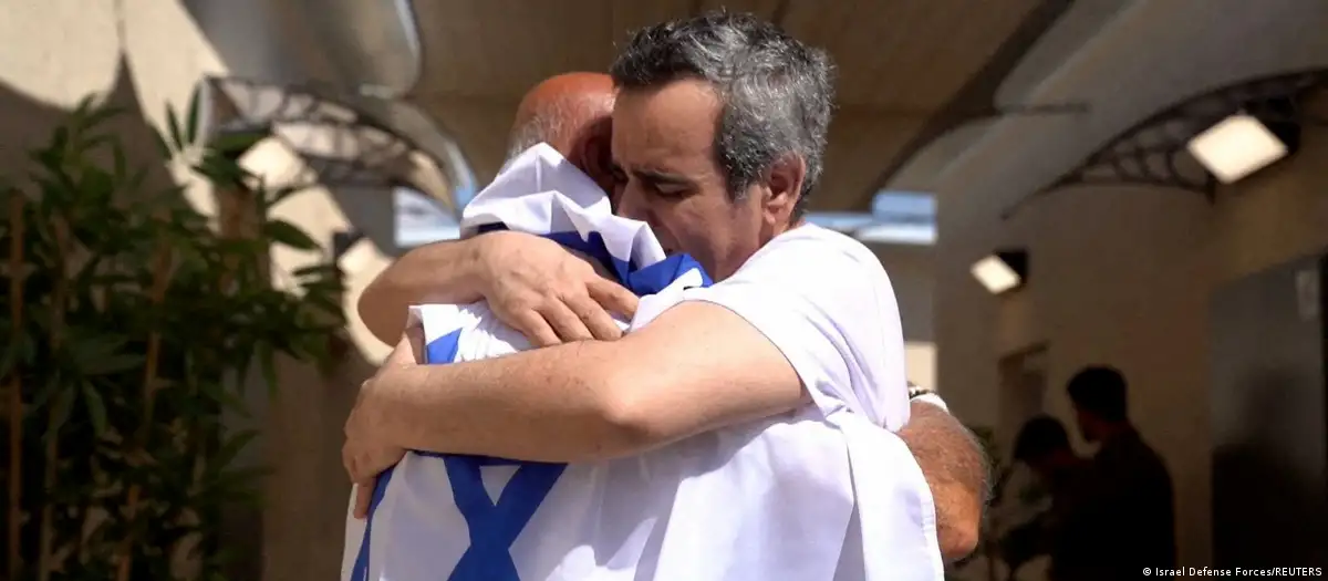مشاعر متضاربة في إسرائيل، فرح بإطلاق سراح الرهائن العشرين الباقين على قيد الحياة والذين احتُجزوا في غزة لمدة عامين، وحزن على بقاء عدة جثث لرهائن لم تُعيدهم حركة حماس (المصنة منظمة إرهابية من قبل ألمانيا والولايات المتحدة والاتحاد الأوروبي ودول أخرى) لأسباب لوجستية. ومع ذلك روى العائدون قصصاً عديدة عن فترة احتجازهم.
