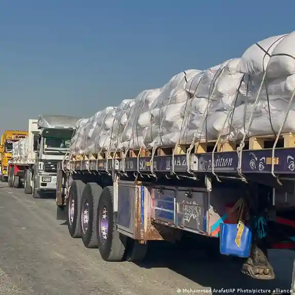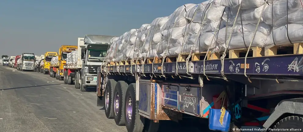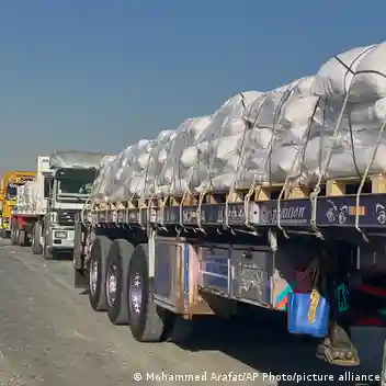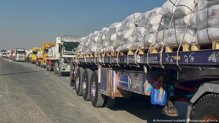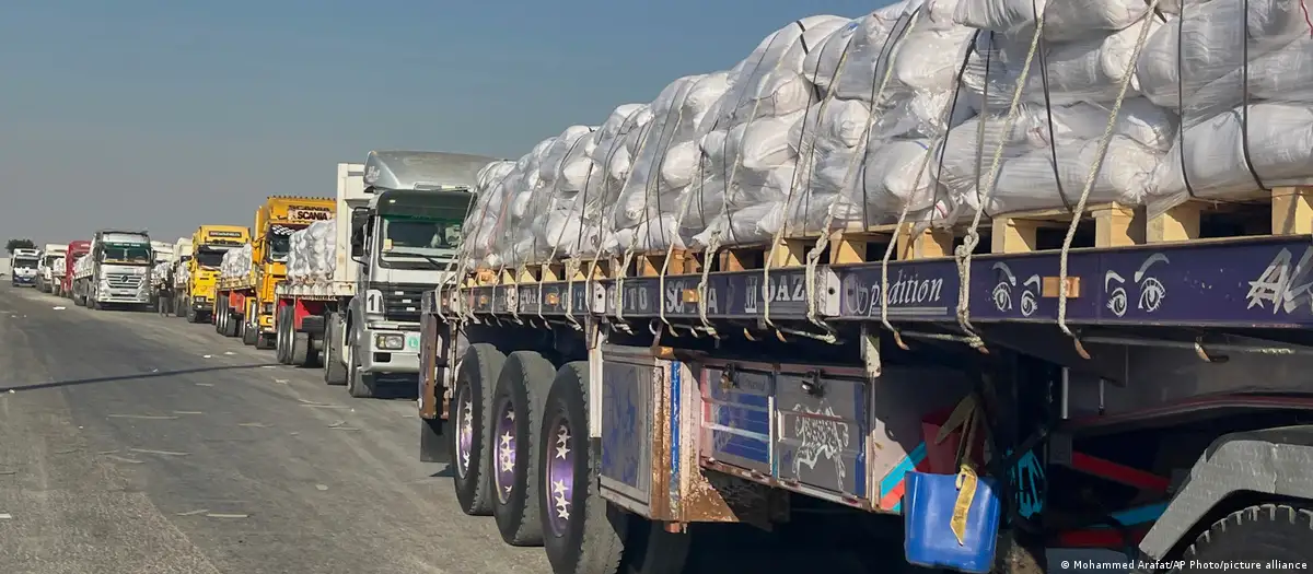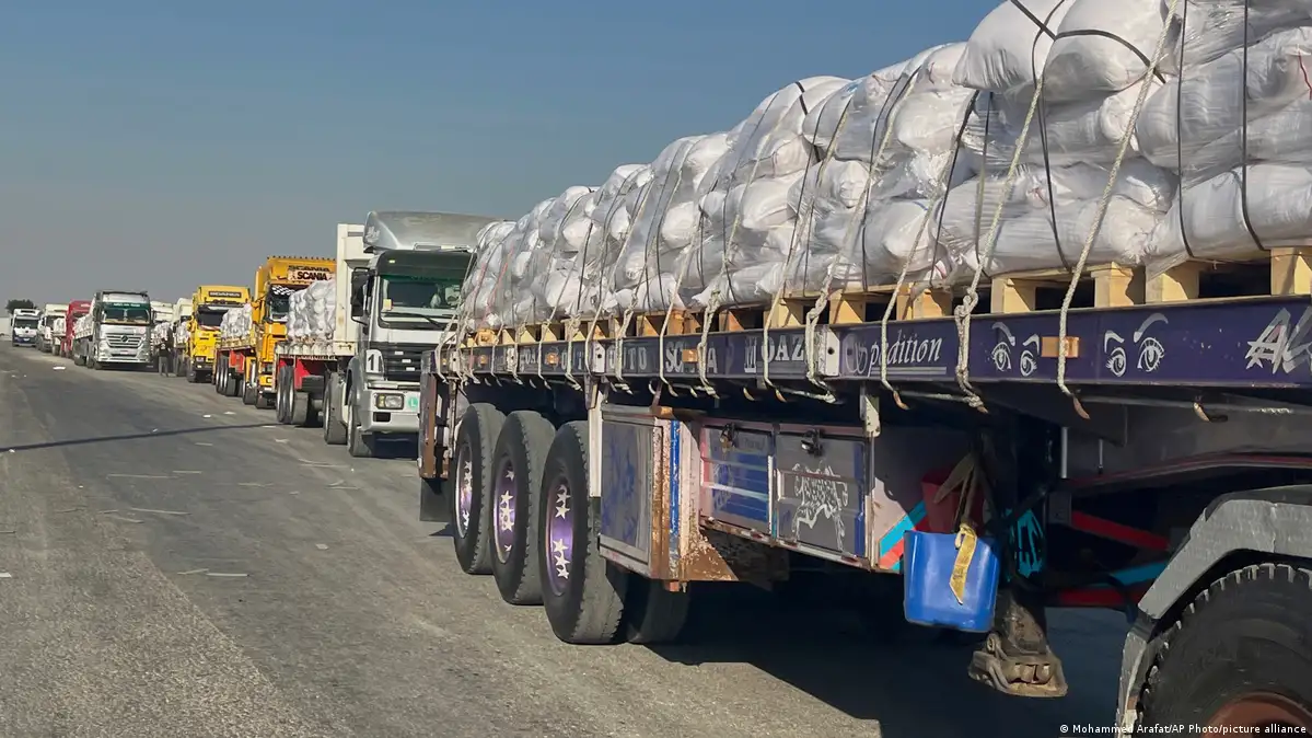 وأظهرت صور وشريط فيديو شاحنات ضخمة محمّلة بأكياس بيضاء تدخل عبر بوابة معبر رفح من الجانب المصري والذي يؤدي الى جنوب قطاع غزة. إلا أن الشاحنات لا تدخل مباشرة الى القطاع عبر الجانب الفلسطيني من المعبر المدمّر والمقفل بسبب الحرب. وتسير الشاحنات بعد ذلك كيلومترات قليلة جدا نحو معبر كرم أبو سالم الإسرائيلي حيث يتوقع أن تخضع للتفتيش مجددا قبل دخول منطقة رفح الفلسطينية.