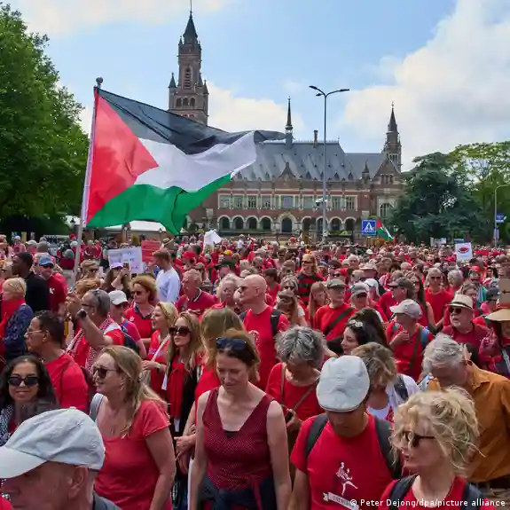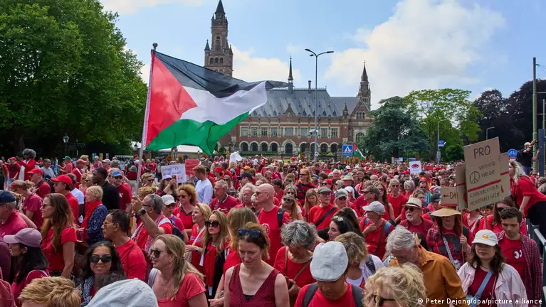 خرج عشرات الآلاف إلى شوارع لاهاي في هولندا، اليوم الأحد، للاحتجاج على العمليات العسكرية الإسرائيلية في غزة، والمطالبة بتغيير جذري في موقف حكومتهم تجاه إسرائيل. وكان معظم المتظاهرين يرتدون ملابس باللون الأحمر للتعبير عن "الخط الأحمر" الذي تجاوزته القوات الإسرائيلية، بارتكابها ما وصفها المحتجون بأنها إبادة جماعية في غزة.