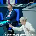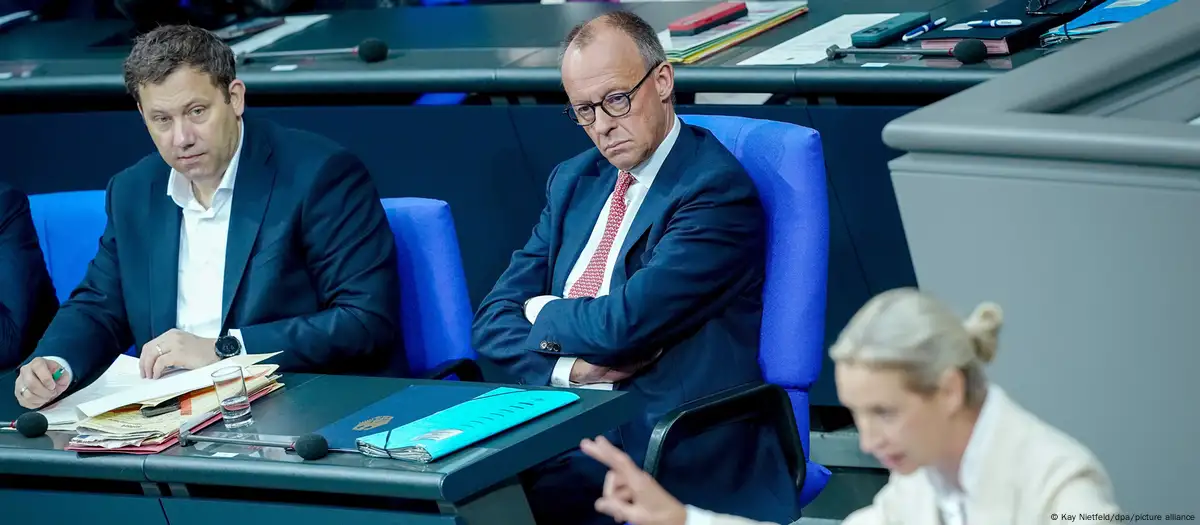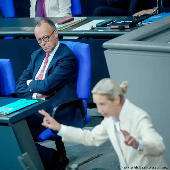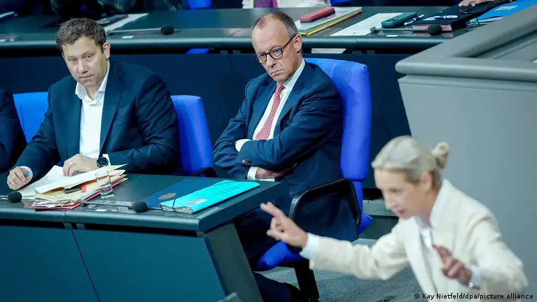 المستشار الألماني فريدريش ميرتس (وسط الصورة) ونائبة على اليسار وفي يمين الصورة زعيمة حزب البديل أليس فايدلصورة من: Kay Nietfeld/dpa/picture alliance