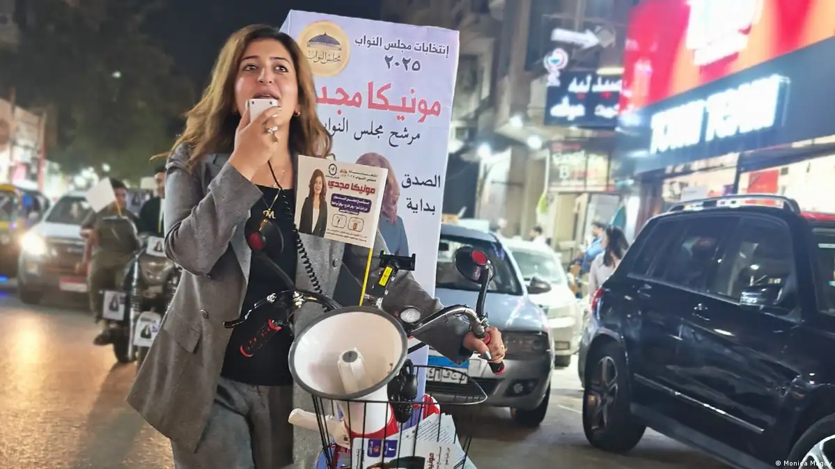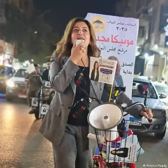على دراجة صغيرة، جابت المرشحة للبرلمان المصري مونيكا مجدي (34 عاماً)، شوارع دائرتها شبرا وروض الفرج وبولاق أبو العلا، مخاطبة الناس بميكروفون: "أنا مونيكا مجدي، رمز الأسد، رقم 2، موجودة عشانكم، وعلشان أكون صوت الحق".