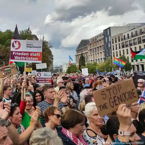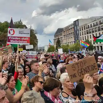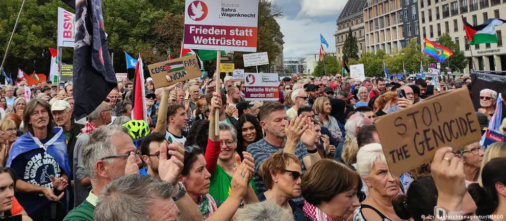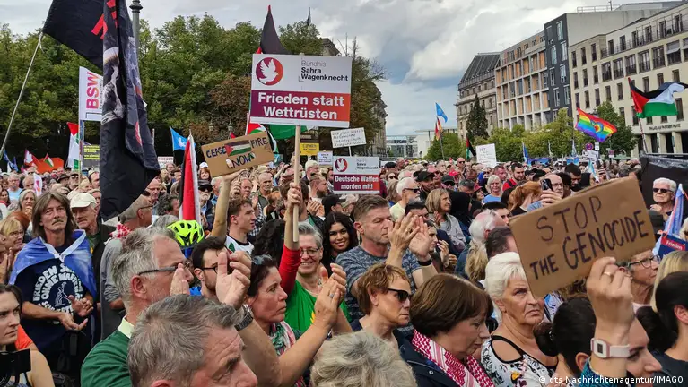 أفادت الشرطة الألمانية بأن ما لا يقل عن 12 ألف شخص تجمعوا عند بوابة براندنبورغ في العاصمة برلين اليوم السبت (13 سبتمبر/أيلول 2025) في مظاهرة بعنوان "أوقفوا الإبادة الجماعية في غزة". وهي اتهامات التي ترفضها إسرائيل تماما.