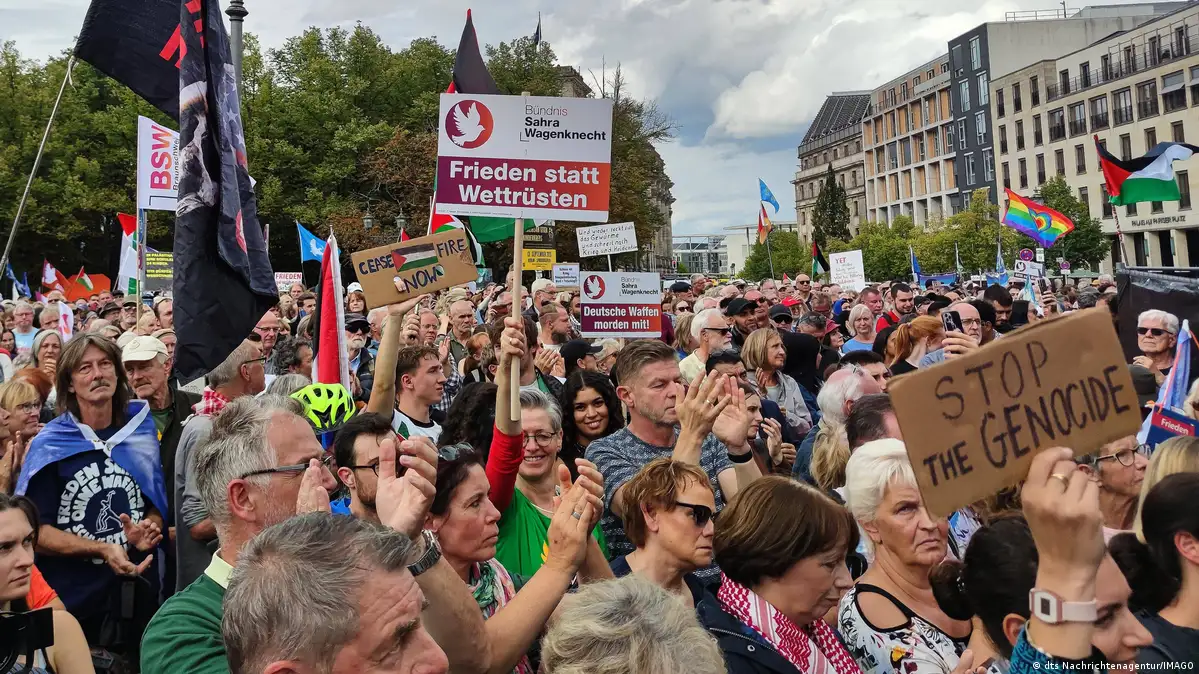 ورفع كثير من المشاركين أعلاما تحمل حمامة السلام، فيما لوح آخرون بالأعلام الفلسطينية، وارتفعت بين الحين والآخر هتافات "حرروا فلسطين". وحملت لافتات شعارات تطالب بالسلام والتفاوض بدلا من إرسال شحنات الأسلحة. وقالت فاغنكنشت إنه لا شيء يبرر قتل الناس وقصفهم في غزة، وأضافت أن "كل حرب هي جريمة"، لتلقى تصفيقا من الحضور.