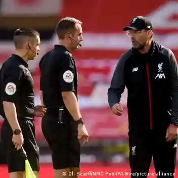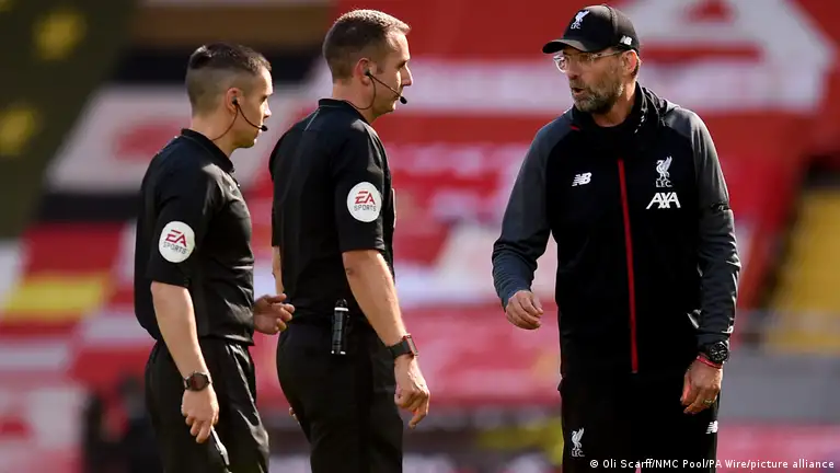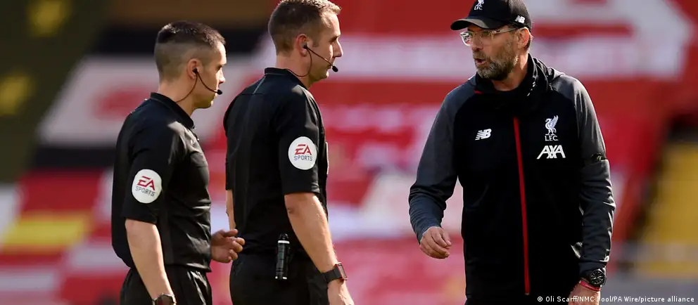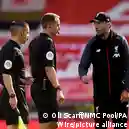 يورغن كلوب يتحدث للحكم ديفيد كوت (11/7/2020). انتشر مقطعان فيديو لكوت استخدم فيهما لفظا بذيئا للإشارة لليفربول، وآخر مهينا لكلوب. صورة من: Oli Scarff/NMC Pool/PA Wire/picture alliance