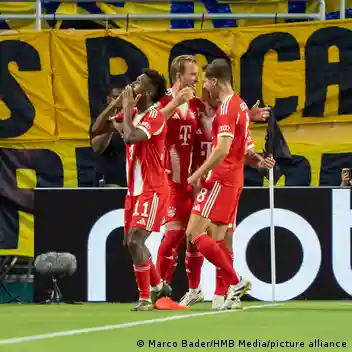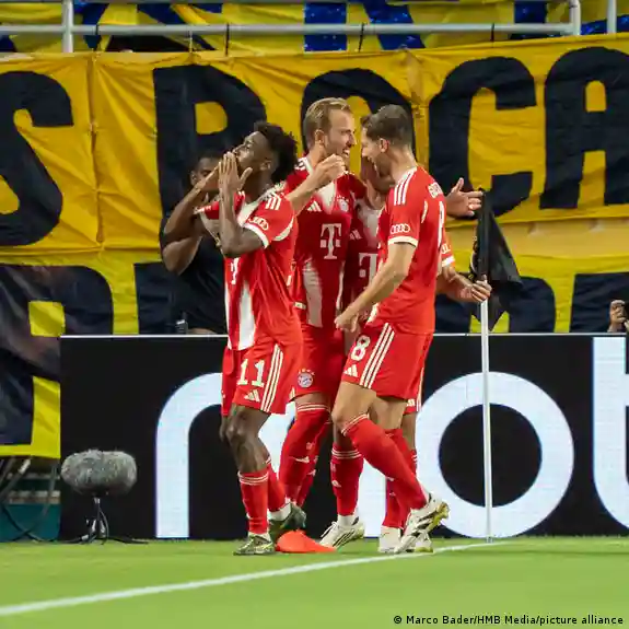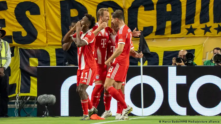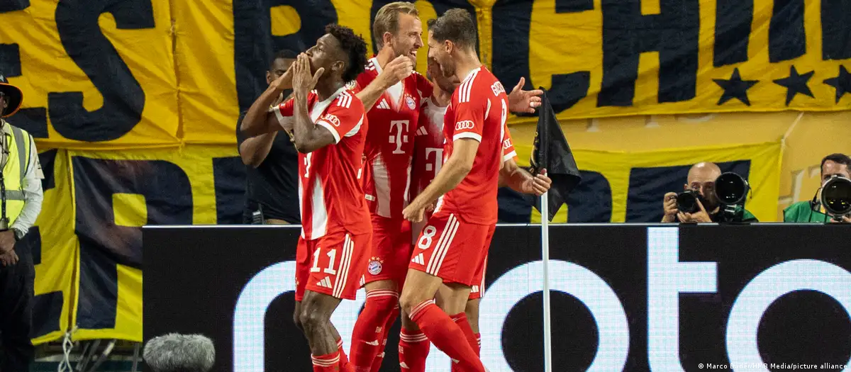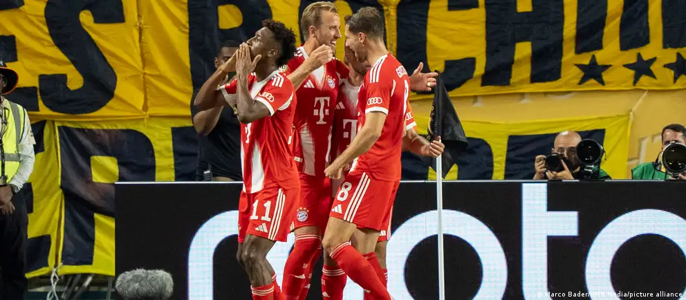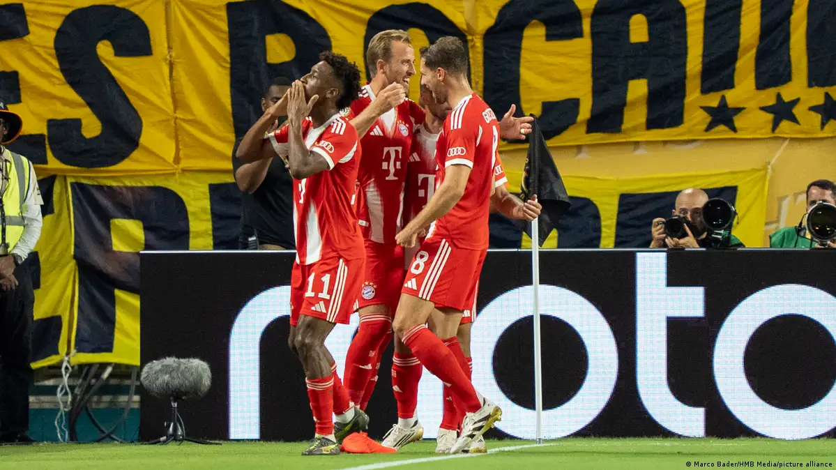 هاري كين يحتفل مع غوريتسكا بعد التسجيل في شباك بوكا جونيورز، بينما يرسل كومان القبلات للجماهير. بعد الصعود لثمن النهائي، أعرب كين عن قدرة الفريق البافاري على الذهاب بعيدا في المسابقة. صورة من: Marco Bader/HMB Media/picture alliance