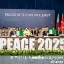 واستقبل ترامب القادة واقفا على منصة مدّ عليها بساط أحمر، مبتسما ومصافحا تباعا كلّ واحد منهم، وأمامه لوحة كتب عليها بالإنجليزية "السلام 2025" وخلفه لافتة كبيرة كتب عليها بالإنجلزية أيضا "السلام في الشرق الأوسط". ورفع الرئيس الأمريكي إبهامه مرارا أمام الكاميرات.