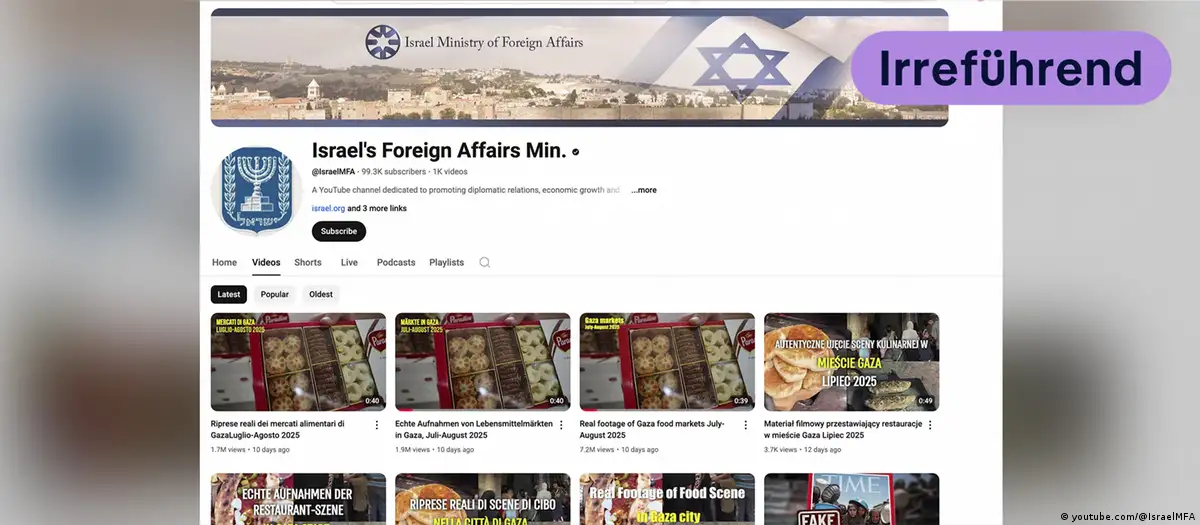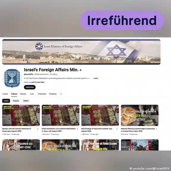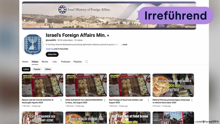لقد قامت إسرائيل في 22 آب/أغسطس، وهو اليوم نفسه الذي أعلنت فيه مبادرة التصنيف المتكامل لمراحل الأمن الغذائي (IPC) المعترف بها دوليًا عن المجاعة في أجزاء من قطاع غزة، بإطلاق حملة دعائية جديدة هدفها: إنكار المجاعة في غزة. وروّجت وكالة الإعلان الإسرائيلية تحديدًا لمقطعي فيديو متعددي اللغات، تم نشرهما على حساب وزارة الخارجية الإسرائيلية. ويمكن التعرّف من خلال علامة "صح" السوداء بجوار اسم الحساب على أنَّه يتبع رسميًا الحكومة الإسرائيلية.