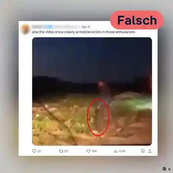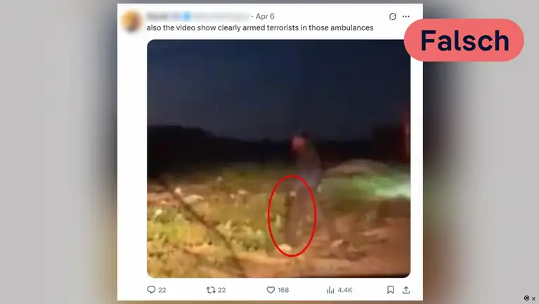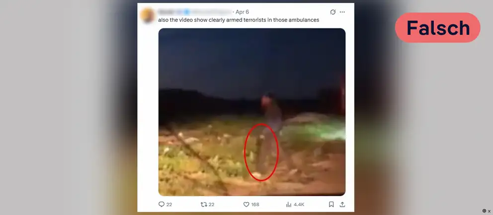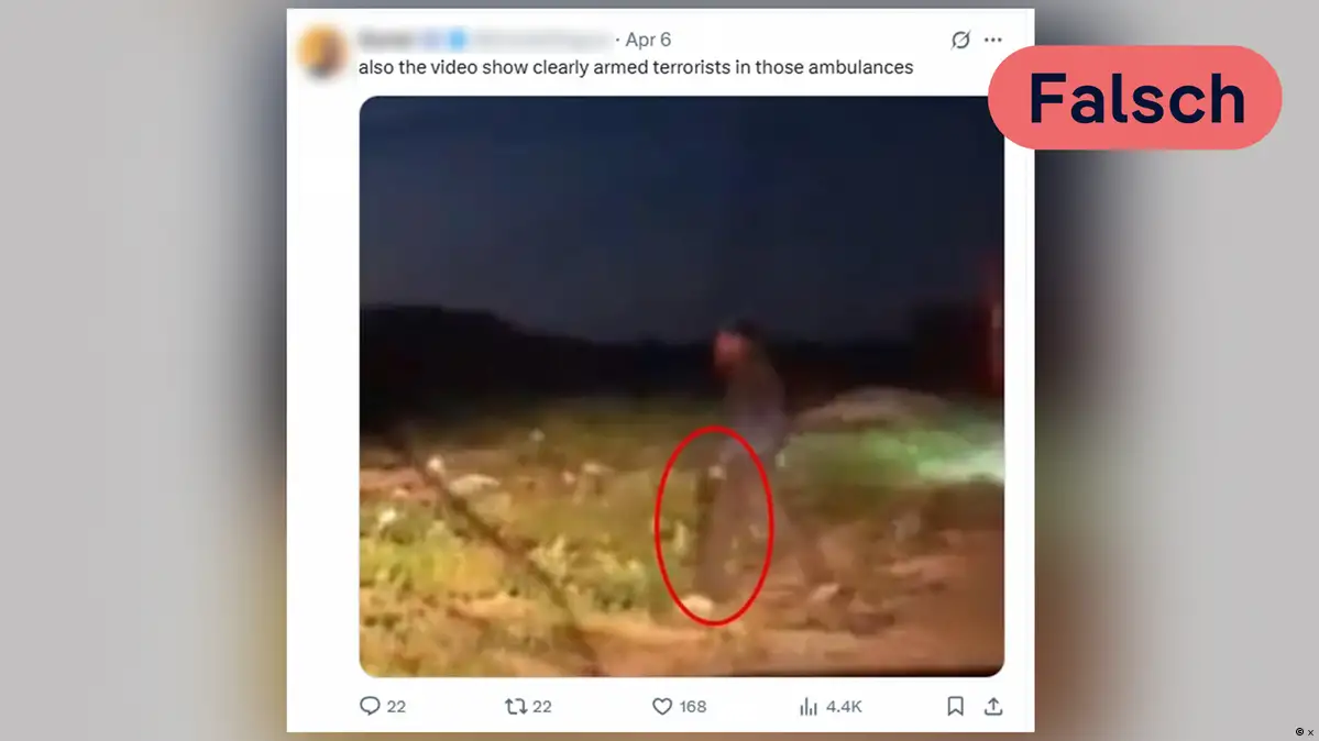 الادعاء: نشر أحد مستخدمي منصة X (تويتر سابقًا) صورة ثابتة غير واضحة من الفيديو، يُزعم أنها تُظهر أحد المسعفين المفترضين وأمامه بقعة داكنة مستطيلة على يده اليسرى محاطة بدائرة حمراء، وجاء في التعليق المرفق: "يُظهر الفيديو بوضوح إرهابيين مسلحين داخل سيارات الإسعاف هذه."