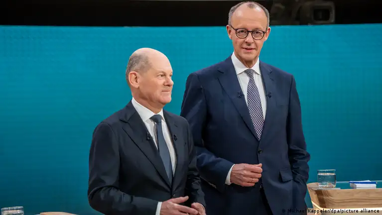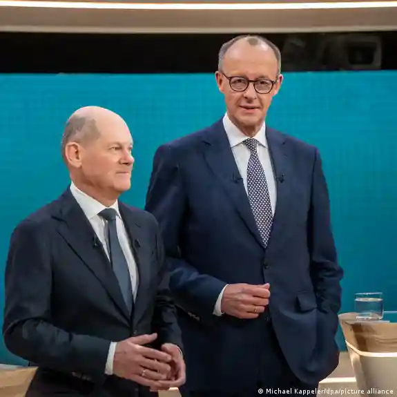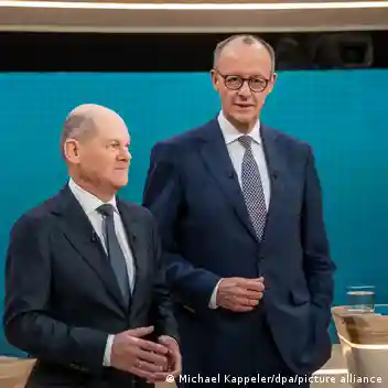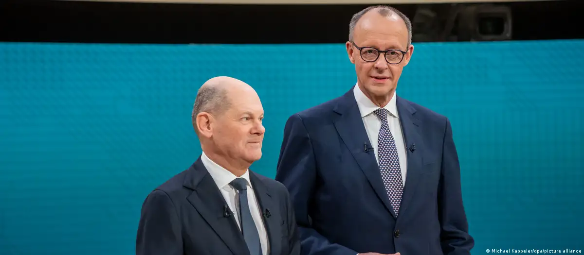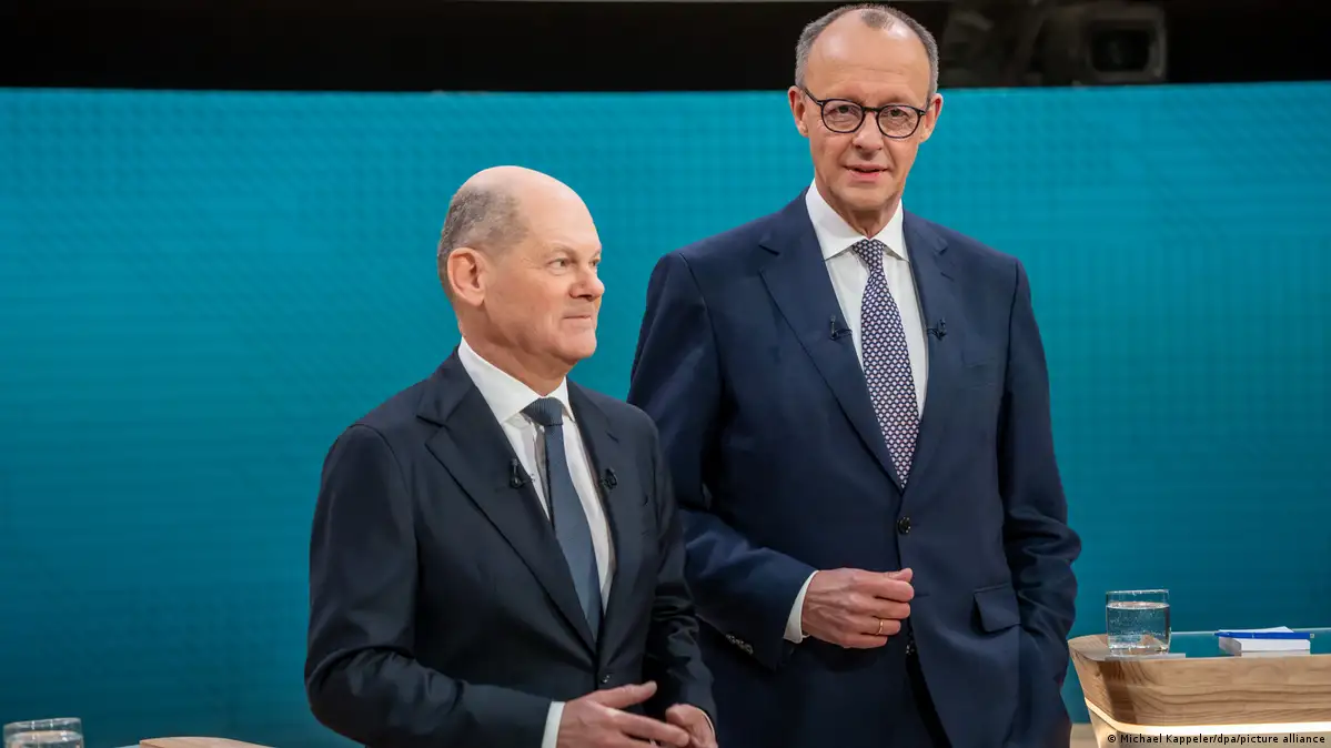 Някои определят дуела като неравен – но не защото канцлерът Олаф Шолц е с 30 см по-нисък от лидера на опозиционния Християндемократически съюз (ХДС) Фридрих Мерц, а понеже управляващата Социалдемократическа партия (ГСДП) на Шолц изостава в допитванията почти двойно от консерваторите – тя има около 15%, а ХДС на Мерц около 30 на сто. На предстоящите избори в Германия е заложено на карта политическото бъдеще на Шолц – той ще остане политик само ако Социалдемократическата партия заеме първото място. Шолц заяви от самото начало, че в случай на победа на ХДС той няма да приеме пост на вицеканцлер. Затова ако изборите бъдат спечелени от 69-годишния Фридрих Мерц, 66-годишният Шолц ще трябва да излезе в пенсия.