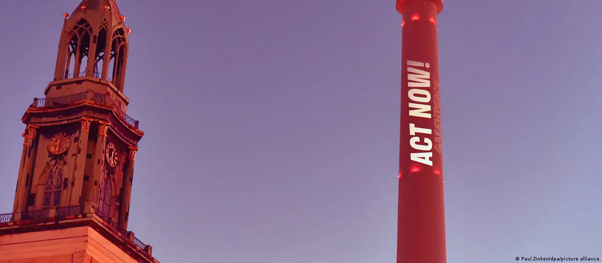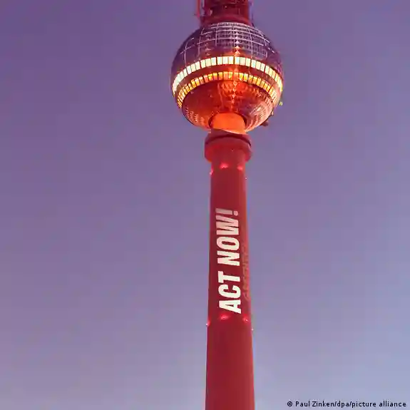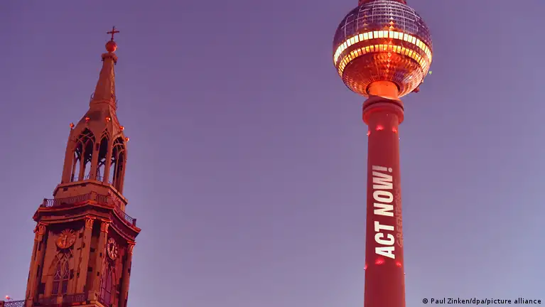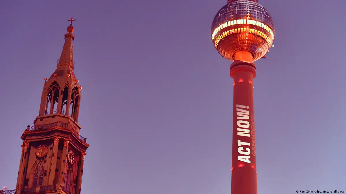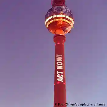"Jetzt handeln": Die Umweltorganisation Greenpeace appelliert mit einer Lichtaktion am Berliner Fernsehturm für mehr Klimaschutz - und beklagt, Deutschland und die EU gingen mit einem "schwachen Klimaziel" in die COP30Bild: Paul Zinken/dpa/picture alliance