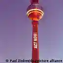 Deutschland Berlin 2025 | Der Berliner Fernsehturm ist rot angestrahlt, auf die aufragende Säule ist in englischer Sprache der Schriftzug "Jetzt handeln" projiziert