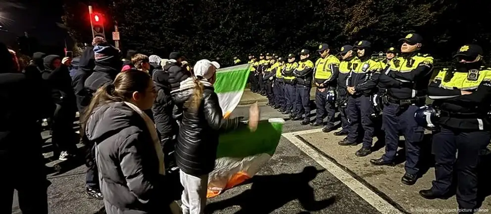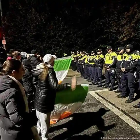 Das frühere Citywest-Hotel in Saggart vor den Toren von Irlands Hauptstadt Dublin am Mittwochabend: Wieder haben sich dort hunderte Demonstranten versammelt - die zweite Nacht infolge. Erneut kommt es zu gewaltsamen Ausschreitungen vor der Unterkunft, in der inzwischen Asylbewerber leben. Ausländerfeindliche Parolen sind zu hören, Flaschen und Ziegelsteine fliegen auf Polizisten, Feuerwerkskörper werden aus der aufgebrachten Menge abgefeuert.
