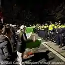 Zwei Polizisten wurden dem Bericht zufolge verletzt und mussten im Krankenhaus behandelt werden. Einer war von einer geworfenen Flasche am Kopf getroffen worden. Die Polizei schritt ein, nahm 23 Personen fest.