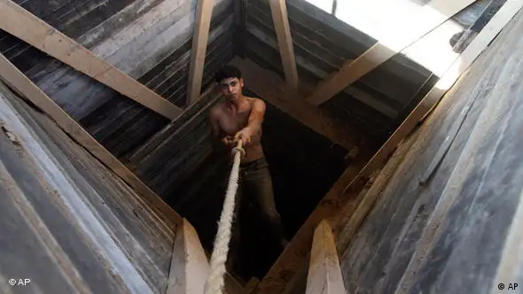Ein Palästinenser lässt sich langsam an einem langen Seil in das dunkle, schwarze Loch eines Tunnels an der Südgrenze des Gazastreifens herab. Wegen der israelischen Blockade sind die Menschen dort gezwungen, Nahrungsmittel und andere Waren aus Ägypten durch die unterirdischen Gänge nach Gaza zu schmuggeln. Und so wandern jede Nacht Reis, Benzin, Motorräder und sogar ganze Schafherden still und heimlich von einer Seite der Grenze zur anderen. Doch vielleicht nicht mehr lange - denn Ägypten plant, den illegalen Handel unter der Erde mit einer Barriere aus massiven Stahlplatten lahmzulegen. (mp/ap/dpa)