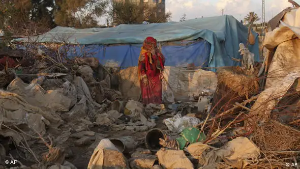 Ein palästinensische Beduinin steht inmitten der Trümmer ihres zerstörten Hauses. Heftige Regenfälle hatten am Dienstag (19.01.2010) im Süden des Gazastreifens zu schweren Überschwemmungen geführt. In Wadi Gaza, einer ländlichen Gegend, in der vor allem Beduinen wohnen, wurden etwa ein Dutzend Menschen verletzt und rund 30 Häuser zerstört. Viele Menschen verloren ihr Hab und Gut, denn das Vieh und die Felder fielen den Schlamm- und Wassermassen zum Opfer. Sicherheitskräfte waren die ganze Nacht im Einsatz, um Menschen zu evakuieren. In der Region wurde der Notstand ausgerufen. (mp/tl/ap/afp)