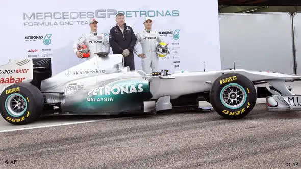 "Dieses Jahr habe ich ein richtig gutes Gefühl", sagte Rekord-Weltmeister Michael Schumacher (li.) in Valencia."Nun habe ich hoffentlich ein Auto, um vorne mitzufahren." Mit seinem deutschen Mercedes-Teamkollegen Nico Rosberg (re., in der Mitte Teamchef Ross Brawn) enthüllte Schumacher in der spanischen Stadt den neuen Silberpfeil mit dem Namen MGP W02.
