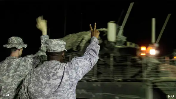 Bild: APDie "Operation Iraqi Freedom" ist beendet: Zwei Wochen früher als angekündigt haben die letzten US-Kampftruppen den Irak verlassen. Im Bild grüßen Feldwebel Jason Thompson, links, und Oberstleutnant Nate Flegle am frühen Donnerstag (19.08.2010) den letzten Konvoi vor dem Überschreiten der Grenze nach Kuwait. 4400 US-Soldaten starben seit der US-Invasion im Irak vor siebeneinhalb Jahren, nach Schätzungen verloren über 100.000 irakische Zivilisten ihr Leben. Eine Billion Dollar kostete der Krieg bislang. (tön/dpa/afp)