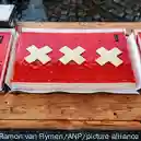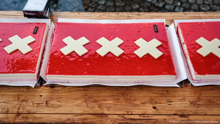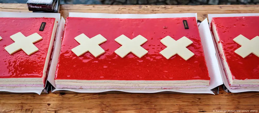 Slices of the cake, which was decorated in Amsterdam's colors of red and white and bore the city's coat of arms, were then delivered to all city districts so that residents could partake of it.