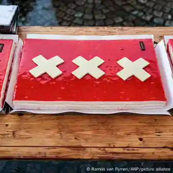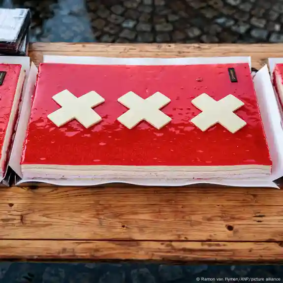 The day's festivities, which come at the end of months of events marking the city's 750th anniversary, kicked off at 7:50 a.m. with the cutting of a 75-meter-long (82-yard-long) cream cake by Mayor Femke Halsema on Dam Square, Amsterdam's central plaza.