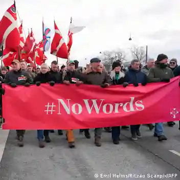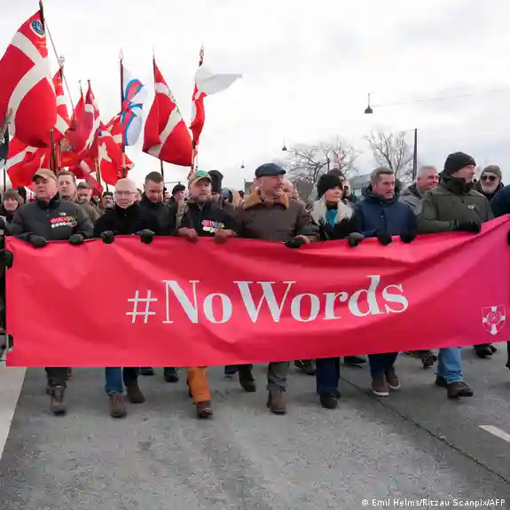 Some of the protesters waved red and white flags, the colors of the Danish flags. Others were dressed in military uniform.