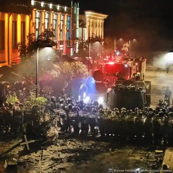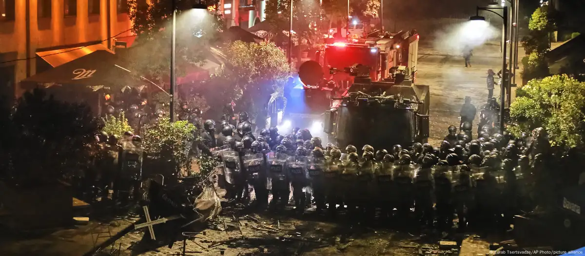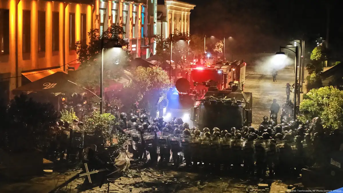 Saturday saw riot police deploy tear gas and water cannons on anti-government demonstrators in the city center of TbilisiImage: Zurab Tsertsvadze/AP Photo/picture alliance