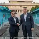 U.S. Defence Secretary Pete Hegseth shakes hands with South Korea's Defence Minister Ahn Gyu-back during his visit to the truce village in the DMZ
