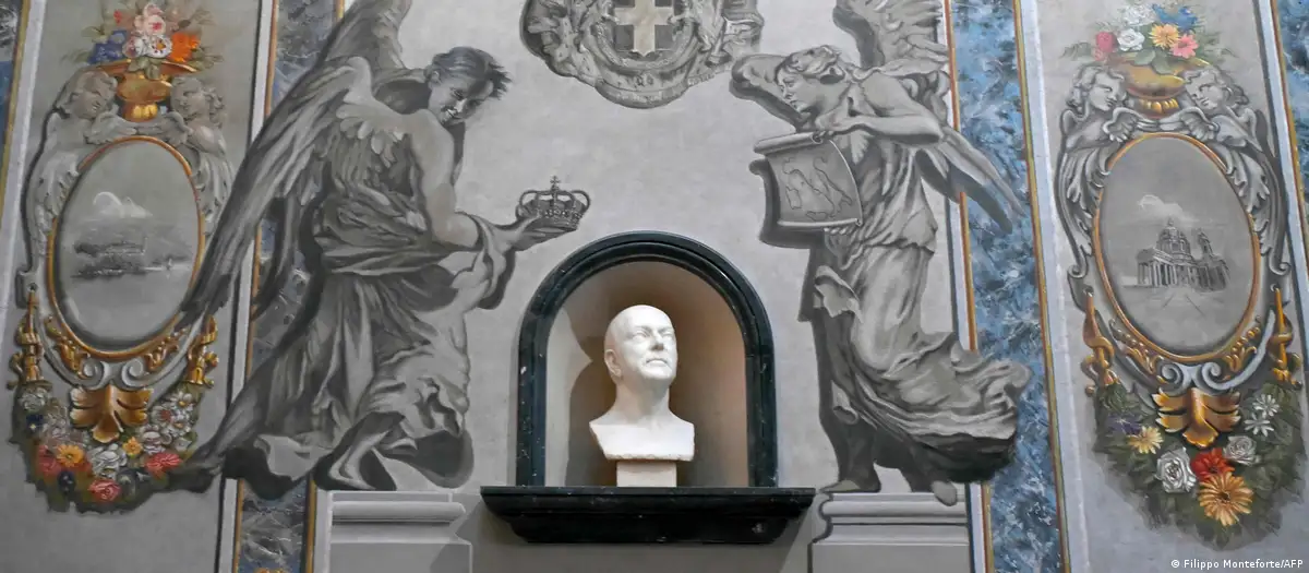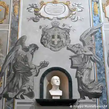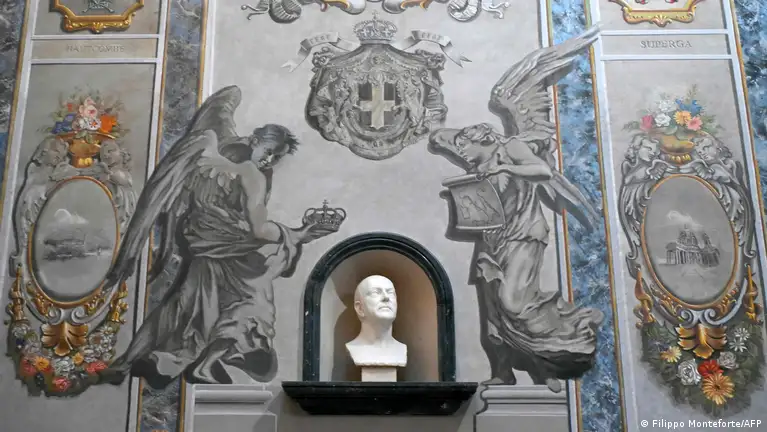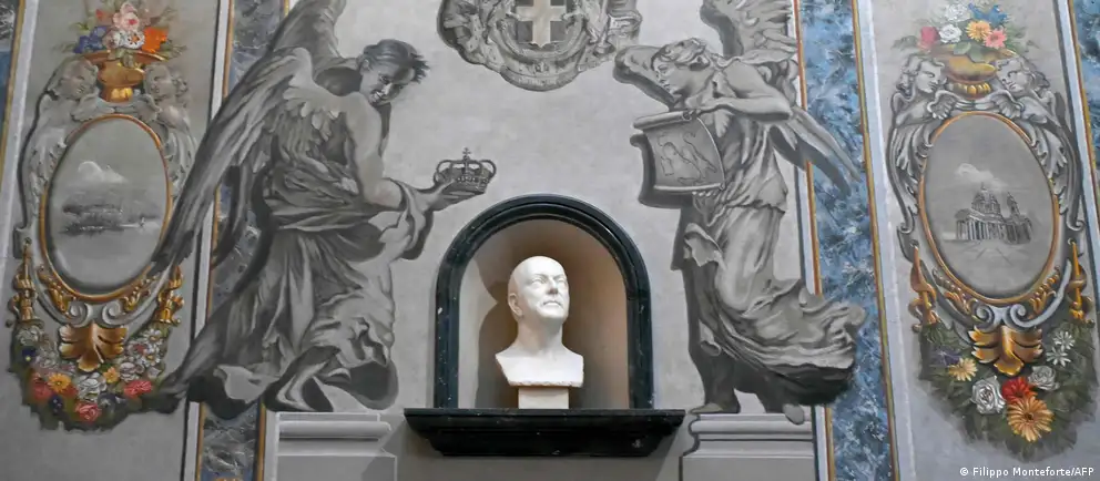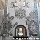 The winged figure is painted in a chapel in the San Lorenzo in Lucina basilica holding a parchment and standing next to a bust of Italy's last king, Umberto II, who was deposed as Italy voted to become a republic in 1946 following World War II.