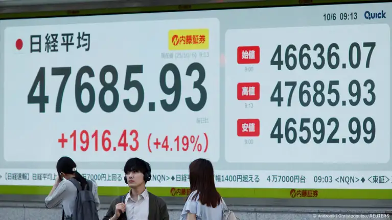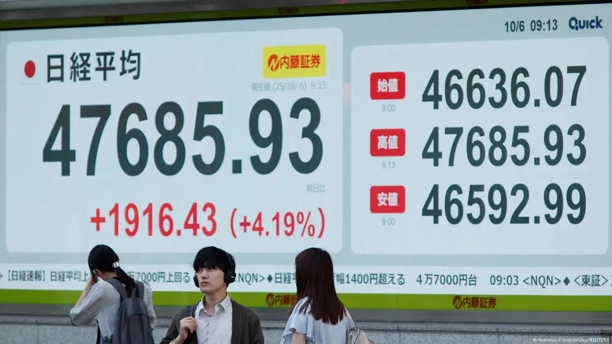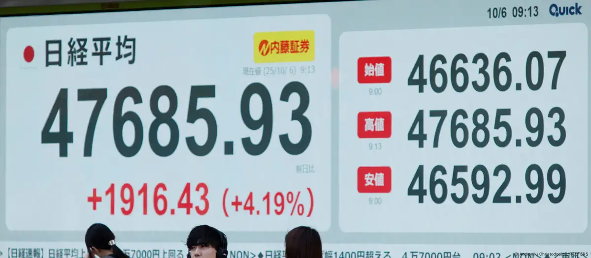 The Nikkei 225 Index was up 4.6%, soaring to 47,852.29, after earlier passing the 46,000 mark for the first time ever.