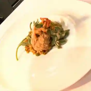 Sauté the ice plant or alternate vegetable in olive oil. Add the rice, the Salmorreta and saffron.