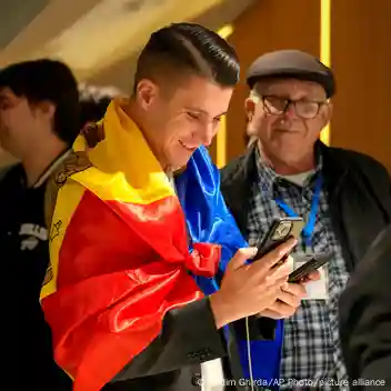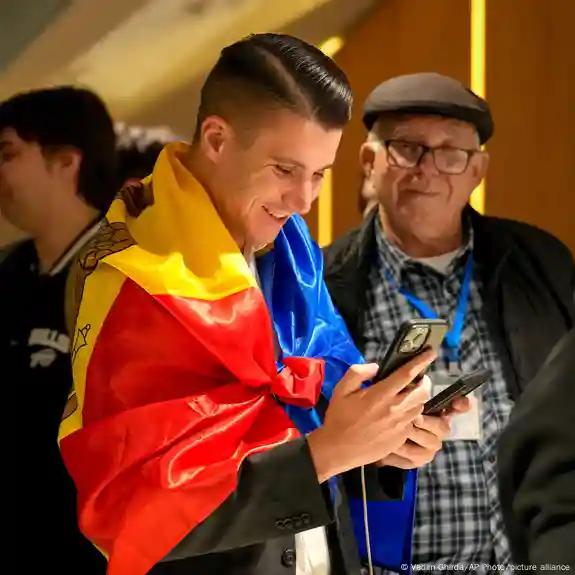 A supporter of the pro-EU Party of Action and Solidarity (PAS) draped in the Moldovan flag smiles as he checks partial results on a phone after the polls closed in the parliamentary election, Chisinau, Moldova, September 28, 2025