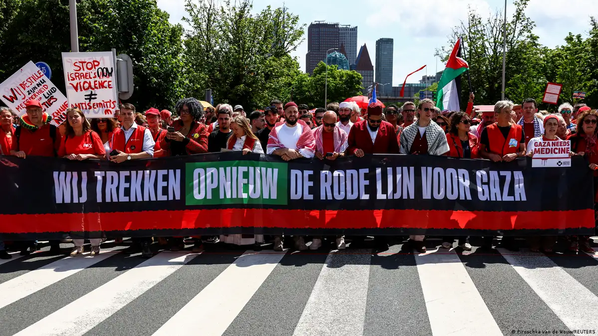 Demonstrators dressed in red represent the red line they say has not been set with Israel over its war in Gaza. The protest was organized by human rights groups and aid agencies including Amnesty International, Doctors Without Borders and Save the Children.