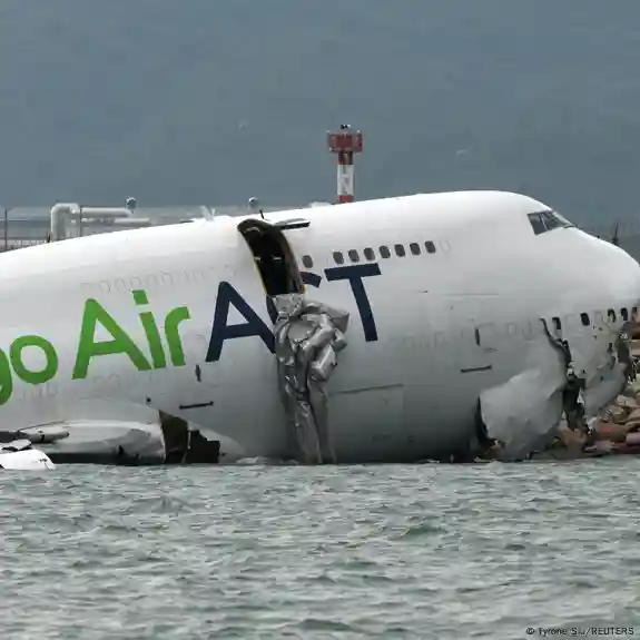 Photos taken after the accident showed the cargo aircraft partially submerged in water near the airport's sea wall with an escape slide deployed and the nose and tail sections separated.