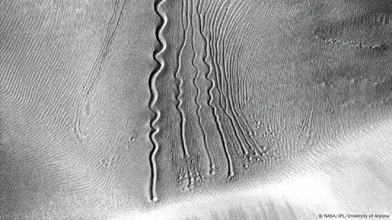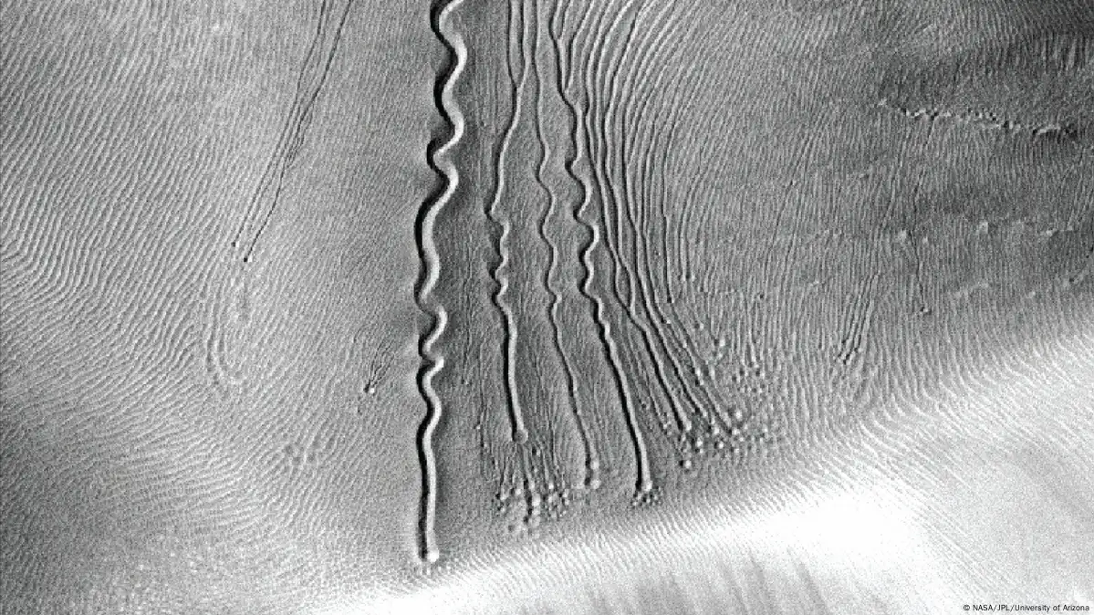 Estas marcas estrechas y profundas, que se extienden como cicatrices por la superficie arenosa del planeta, fueron en su día atribuidas a flujos de agua. Pero una reciente investigación liderada por la geocientífica Lonneke Roelofs, de la Universidad de Utrecht, propone una explicación mucho más exótica –y marciana–: bloques de hielo de dióxido de carbono (CO₂) que literalmente excavan su camino cuesta abajo, dejando huellas que recuerdan a las dejadas por criaturas subterráneas.