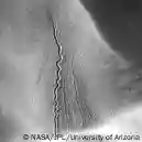 En cambio, en pendientes más suaves, el hielo se entierra parcialmente en la arena y comienza una migración lenta, "excavando" su entorno a medida que la presión del gas expulsado empuja los sedimentos. Este proceso genera canales más sinuosos y profundos, flanqueados por diques de arena.