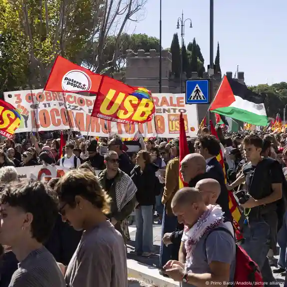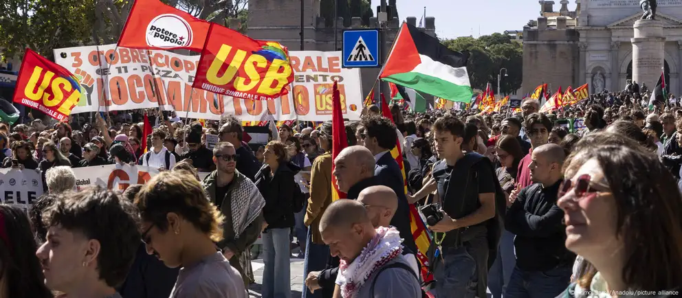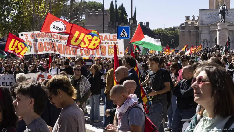 Italia vivió este viernes (03.10.2025) una intensa jornada de huelga nacional y manifestaciones en sus principales ciudades en solidaridad con la flotilla Global Sumud, detenida por Israel cuando intentaba llegar a Gaza, y para denunciar la pasividad del gobierno de la primera ministra Giorgia Meloni frente al bloqueo israelí contra el territorio palestino.