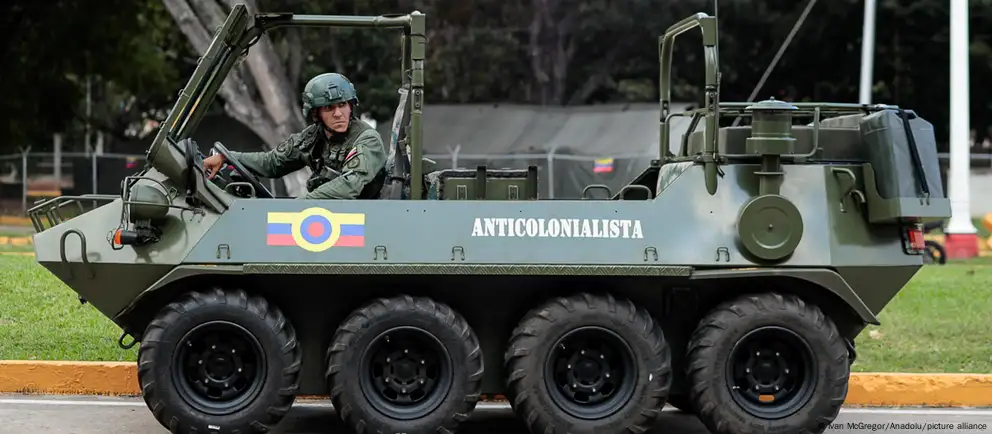 Según estimaciones públicas de la CIA, Venezuela gasta en torno al 0,5 por ciento de su PIB en Defensa (frente a, por ejemplo, el 3,4 por ciento que destina Colombia o el 3,2 por ciento de Estados Unidos), tiene "lazos con los ejércitos de China, Cuba, Irán y Rusia" y cuenta con entre 125.000 y 150.000 militares activos y con unos 200.000 milicianos. A esto hay que sumar el llamado a las armas a los civiles para defender la patria.