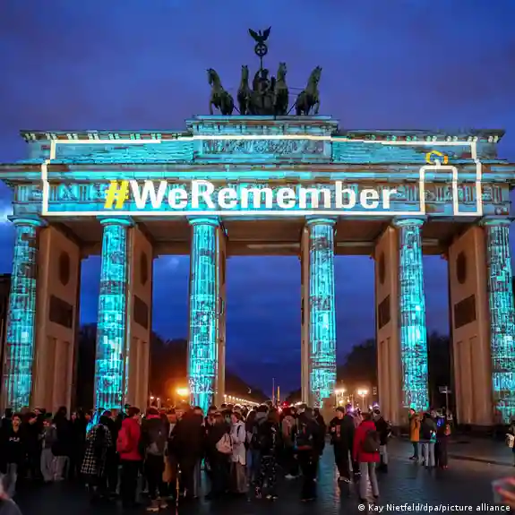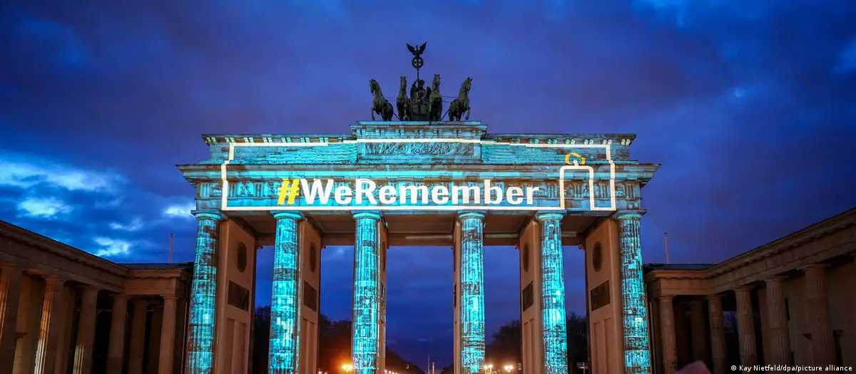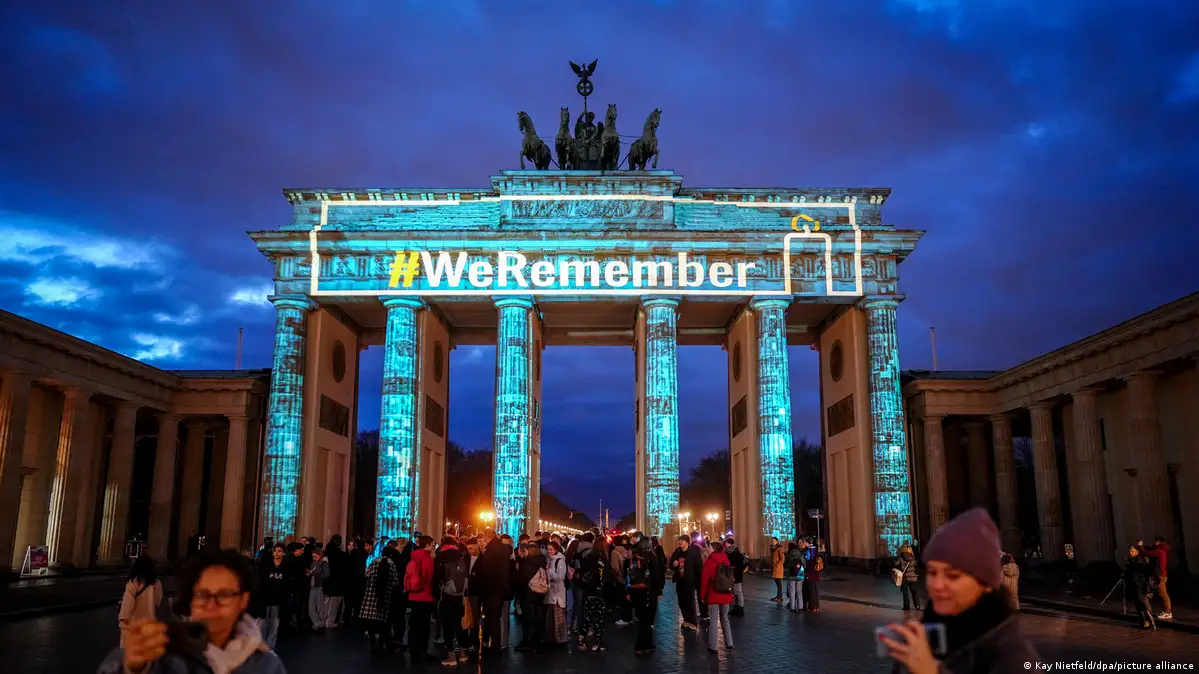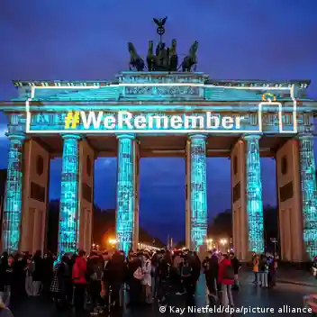 دروازه براندنبورگ برلین در هشتادمین سالگرد آزادسازی اردوگاه آشویتس با نورافشانی "فراموش نمیکنیم"، دوشنبه ۲۷ ژانویه ۲۰۲۵عکس: Kay Nietfeld/dpa/picture alliance