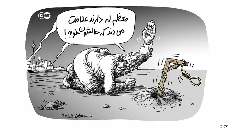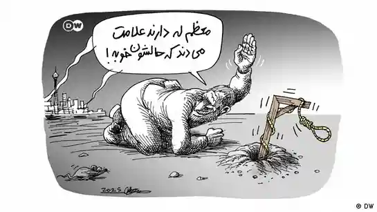 بعد از تقریبا دو هفته از آغاز حملات اسرائیل به ایران و دو روز پس از آتشبس میان دو طرف، علی خامنهای، رهبر جمهوری اسلامی از پناهگاه نامعلوم خود پیام ظفر و پیروزی به بیرون فرستاد اما همچنان بیرون نیامد. همزمان موج عظیمی از بازداشتها، پروندهسازیها و صدور و اجرای احکام اعدام آغاز شد که برخی آن را عزم نظام برای جبران تحقیر در برابر اسرائیل (از دست دادن سرداران سپاه،دانشمندان و تاسیسات هستهای، زیرساختهای نظامی و غیرنظامی و واگذار کردن حریم هوایی و آچمز شدن در برابر حملات پهپادی نیروی بیگانه و ... ) از طریق زهرچشم گرفتن از شهروندان عادی قلمداد کردند؛ شهروندانی که باید طعم اقتدار نظام را با سرکوب داخلی و طناب دار بچشند. این موضوع دستمایه مانا نیستانی برای کاریکاتور هفته بوده است.