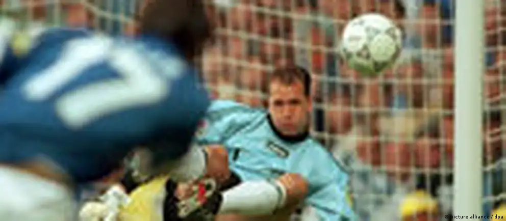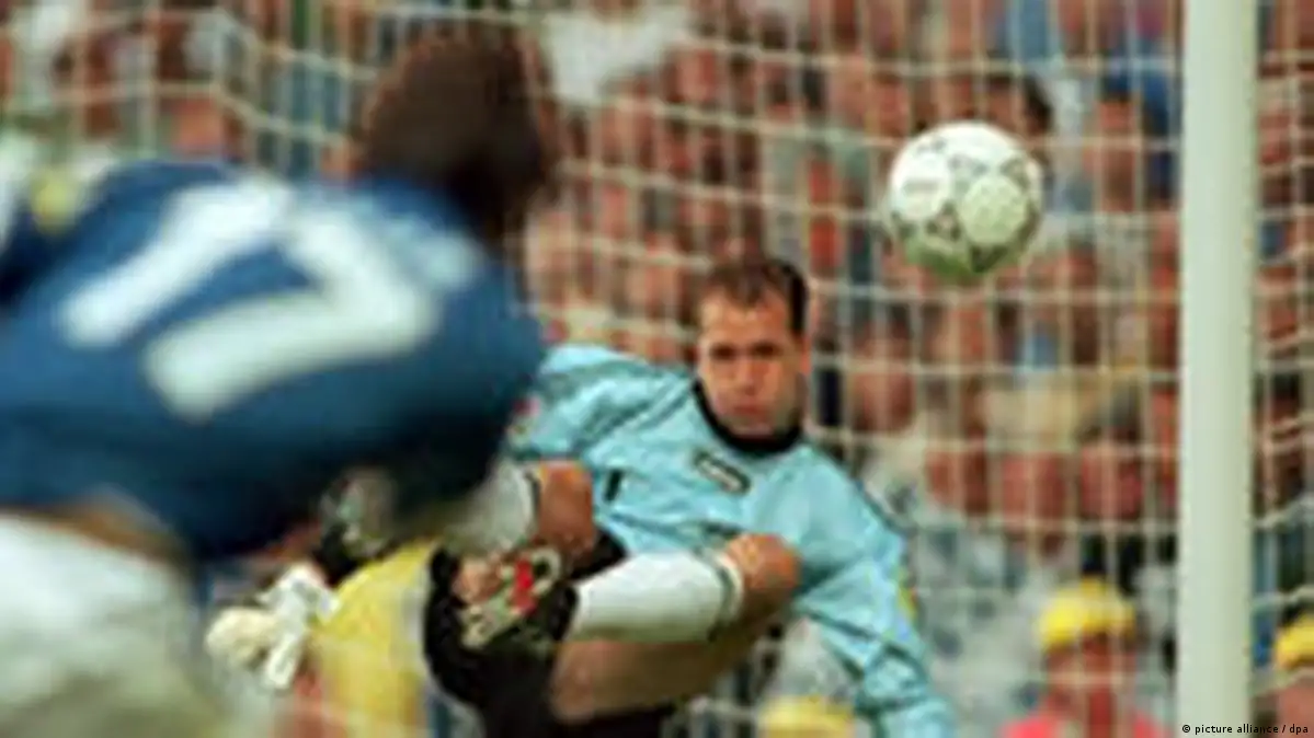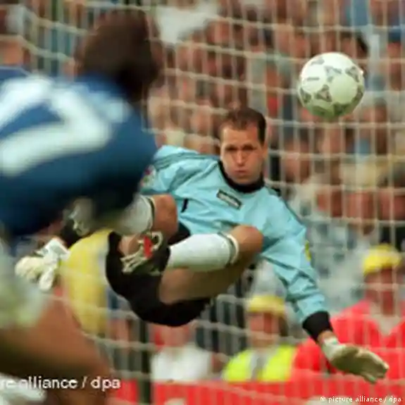 آندریاس کوپکه، دروازبان تیم ملی فوتبال آلمان، در ۱۹ ژوئن ۱۹۹۶ در بازی در برابر تیم ملی فوتبال ایتالیا، در چارچوب بازیهای گروه "C" رقابتهای جام ملتهای اروپا؛ ورزشگاه "اولد ترافورد" شهر منچستر انگلستان. کوپکه در این حرکت ضربه دیگو فوزر ایتالیایی را با ضربهی مشت دفع کرد.عکس: picture alliance / dpa