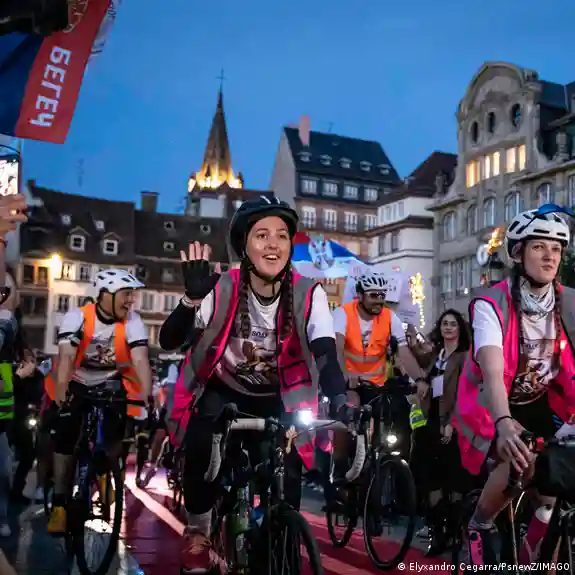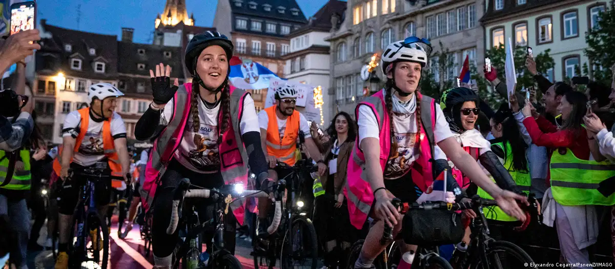 Oko 17 sati na trg su počeli pristizati i mahom mladi na biciklima koji su vozili svoje privatne „ture do Strasbourga“ u znak solidarnosti sa studentima iz Srbije. Neki su krenuli iz Danske, neki iz Švicarske, bilo je biciklista iz Nizozemske, Njemačke i drugih zemalja.