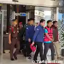 Ketua Ombudsman Hery Susanto (tengah, rompi jingga) dengan tangan diborgol terlihat digiring oleh petugas kejaksaan