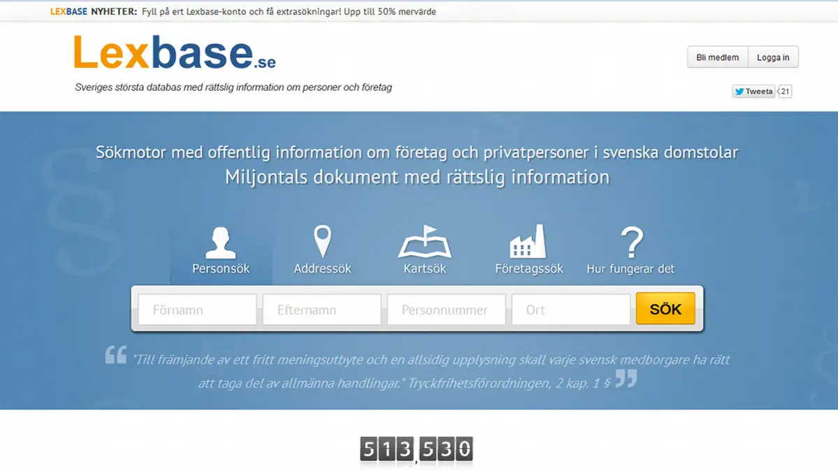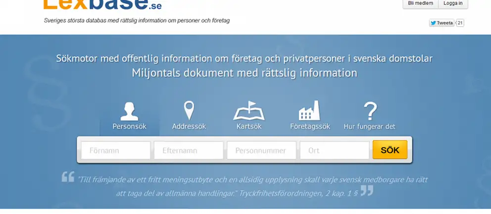 „Лексбејс“ е интернет-банка на податоци со комплетниот шведски регистер на сите осудувани лица во последните пет години, а треба да биде и проширен. Тој е достапен за секој што ќе плати десет евра и тоа сосем легално, оти „Лексбејс“ е регистриран како издавачка фирма во интернет. Во Шведска, за да се гарантира слободата на медиумите, законски сите податоци кои не се тајни, се јавно достапни.