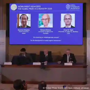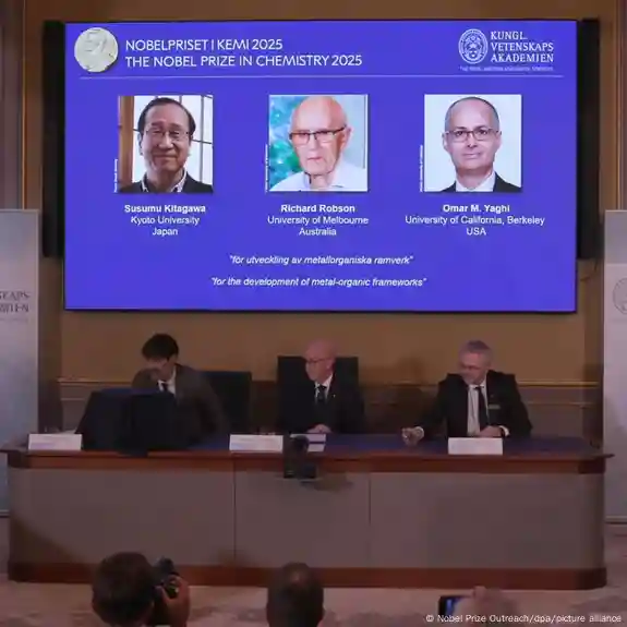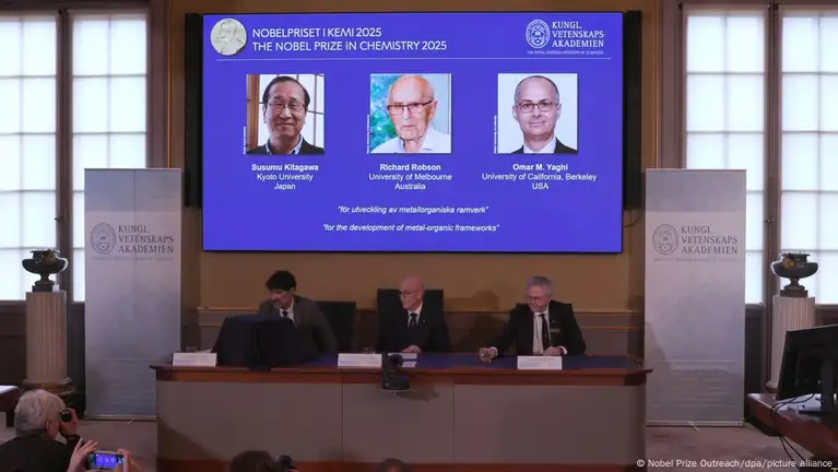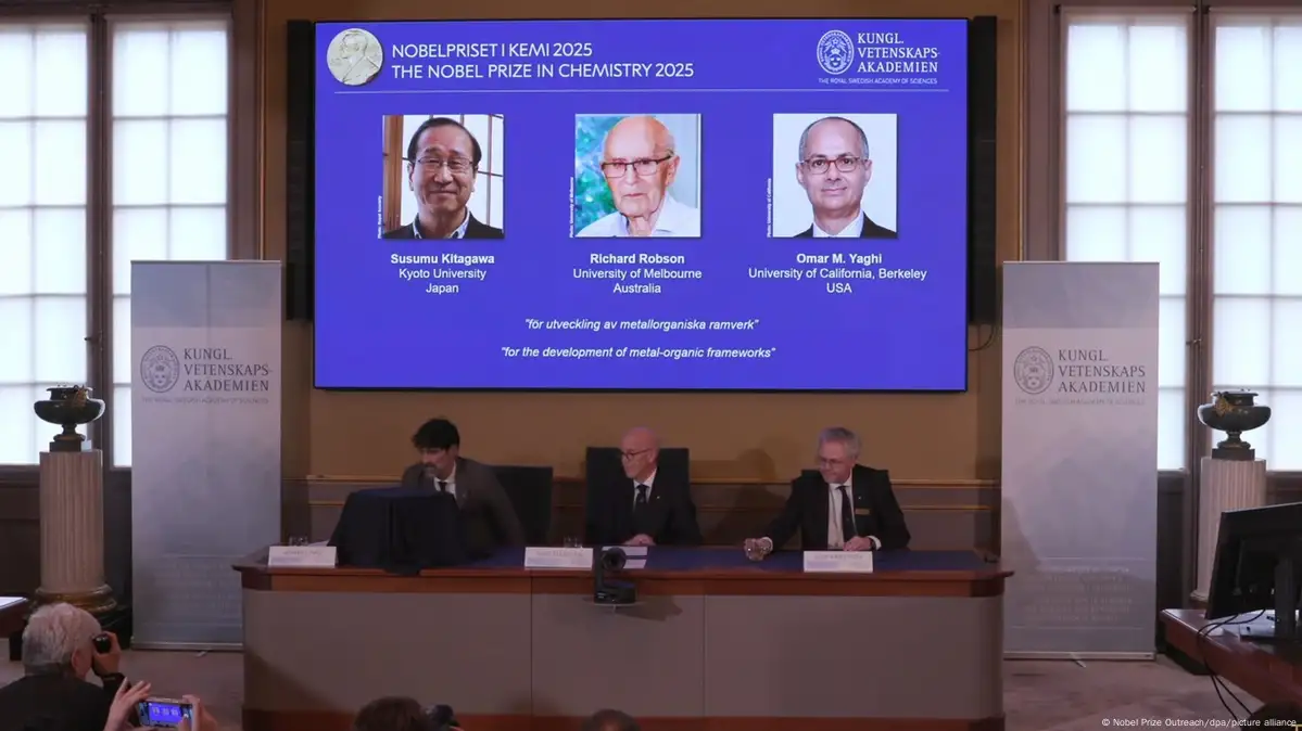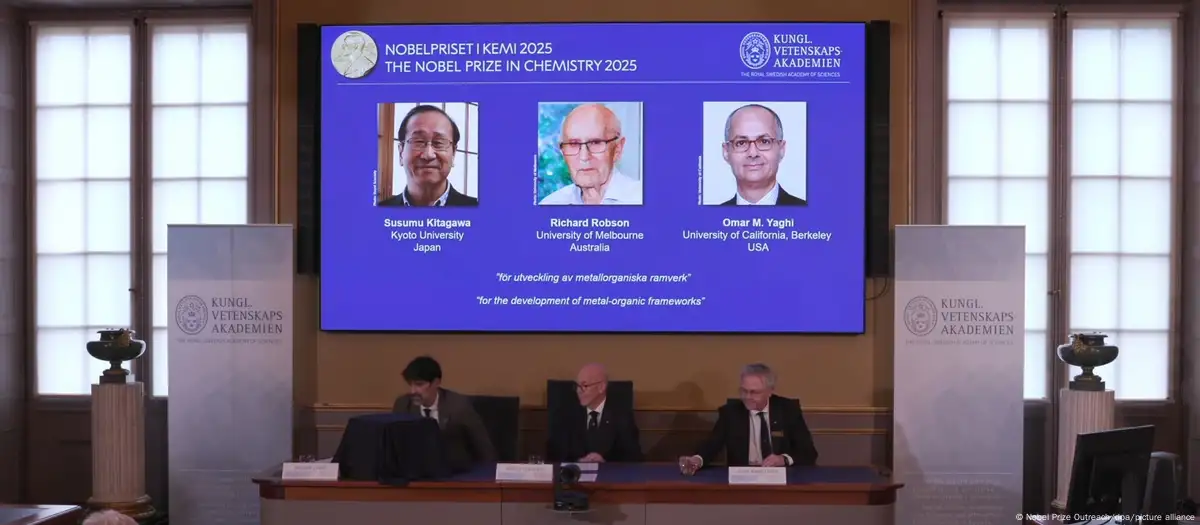 Нобелевскую премию по химии в 2025 году получили Сусуму Китагава из Университета Киото - японский химик, специализирующийся в области координационной химии, австралиец Ричард Робсон из Университета Мельбурна и американский химик иорданского происхождения, профессор химии в Калифорнийском университете в Беркли Омар Яги. Они были удостоены награды за "разработку металлоорганических каркасных структур", объявила Шведская королевская академия наук в Стокгольме в среду, 8 октября.