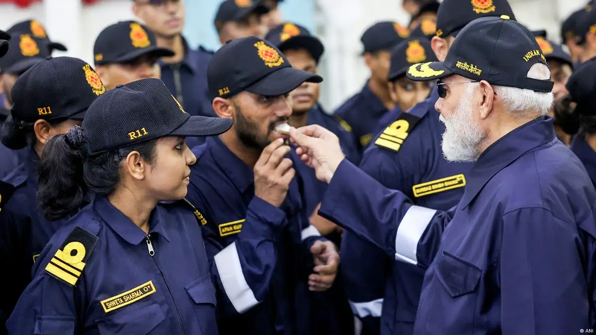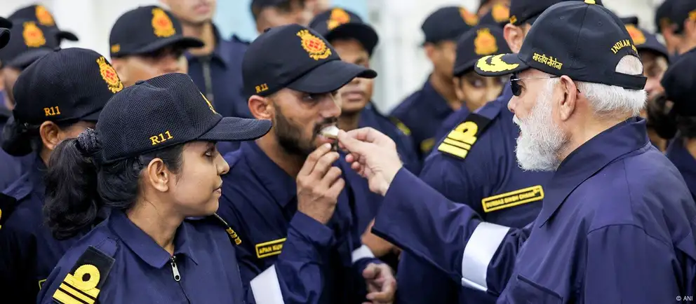 بحریہ کے اہلکاروں سے خطاب کرتے ہوئے مودی نے کہا، ''میرا مقصد یہ ہے کہ بھارت دنیا کے سرکردہ دفاعی برآمد کنندگان میں شامل ہو۔ گزشتہ دہائی میں ہماری دفاعی برآمدات میں تیس گنا اضافہ ہوا ہے، اور اس کامیابی کے پیچھے ہمارے دفاعی اسٹارٹ اپس کا بڑا ہاتھ ہے۔ ہماری سائنس، ہماری خوشحالی، اور ہماری طاقت، سب انسانیت کی خدمت اور اس کے تحفظ کے لیے ہیں۔‘‘